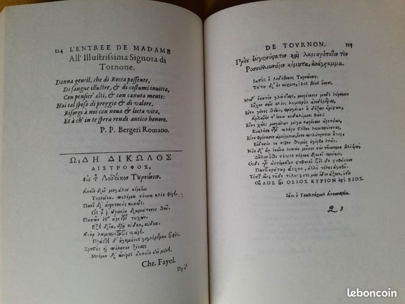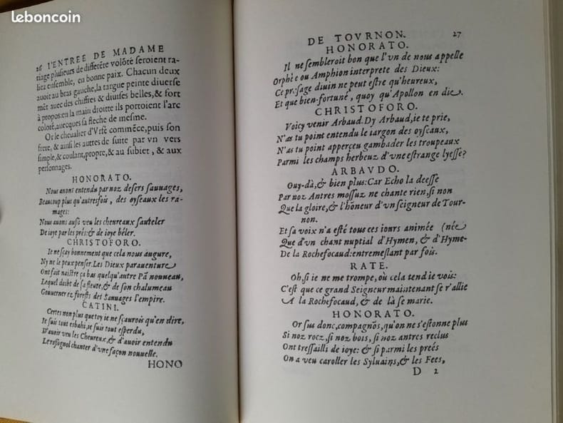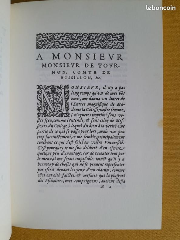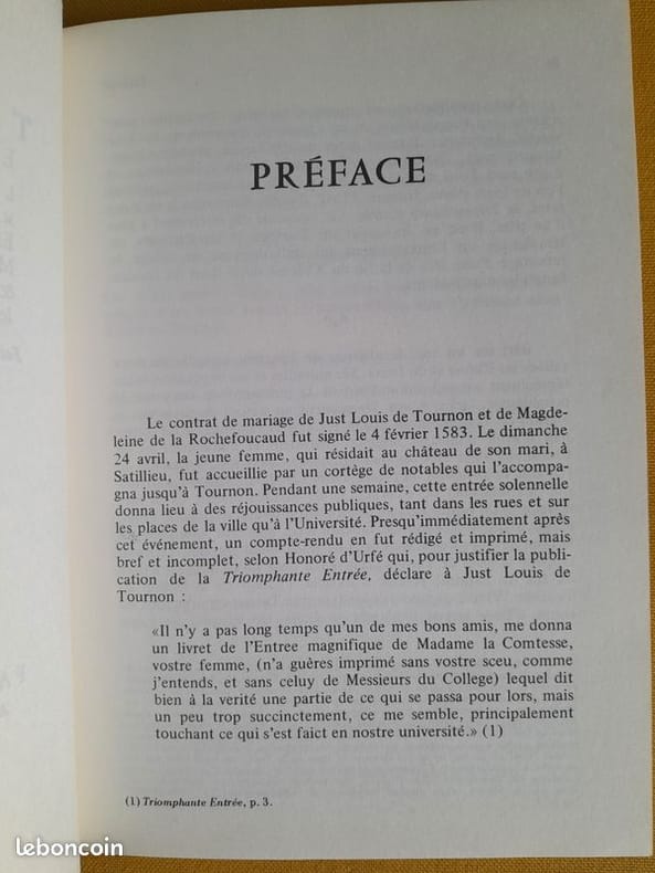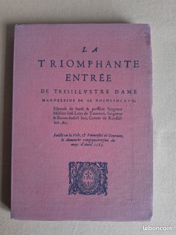 Saint-Étienne, Presses universitaires de Saint-Étienne, coll. "Images et témoins de l'âge classique" n°4, 1976, in 8°, reliure souple de toile brique de l'éditeur, 205 pp., notes, généalogie, carte, "Hymnes sacrez et Odes spirituelles" du Père Michel Coyssard, bibliographie, index, liste des élèves du collège de Tournon cités dans la "Triomphante entrée". Édition fac-similée de l'édition parue à Lyon chez Jean Pillehotte en 1583.