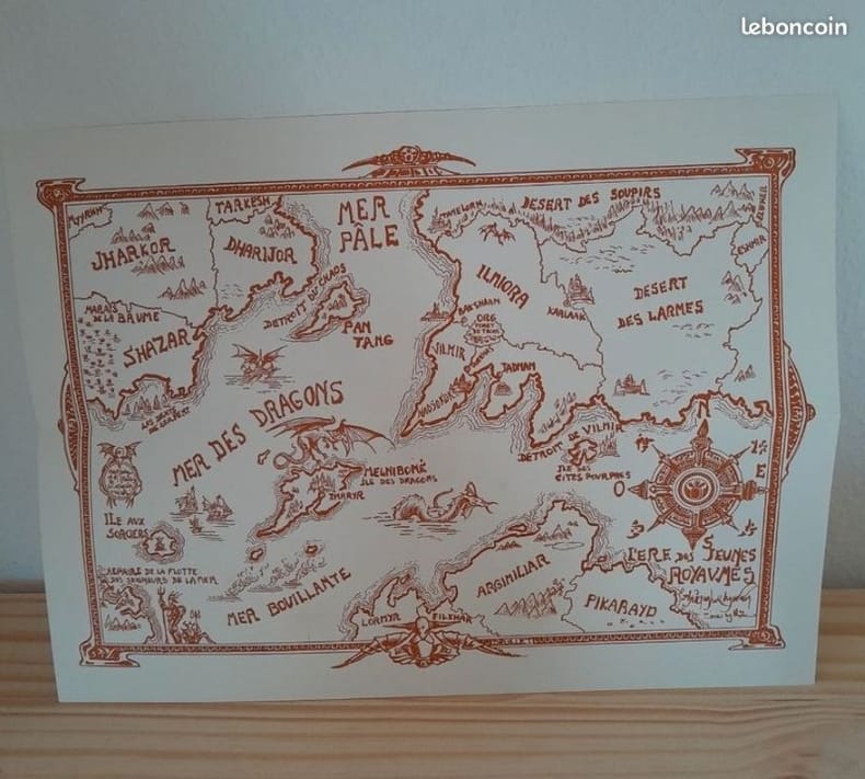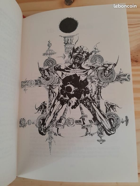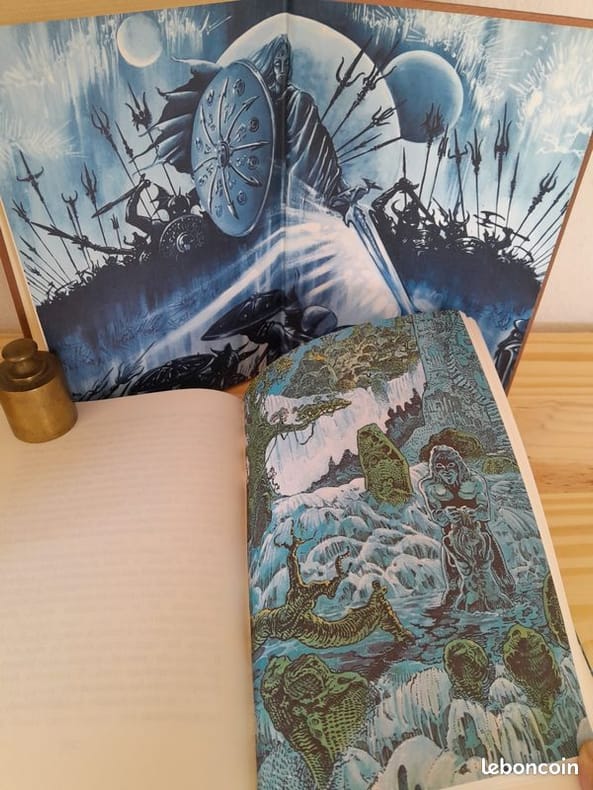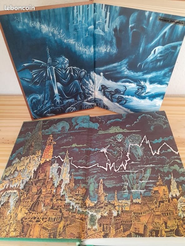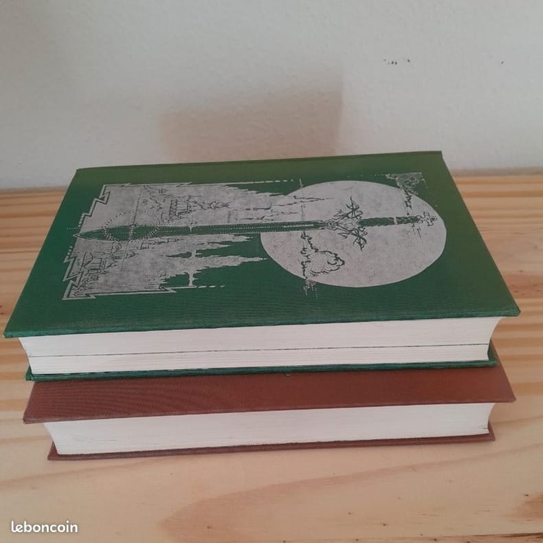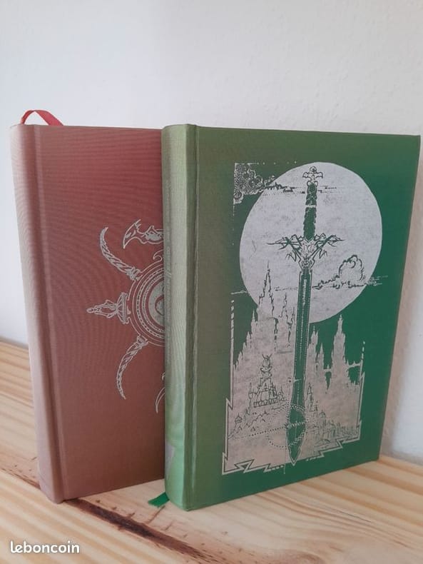 Paris, Éditions OPTA, coll. Aventures fantastiques n°4-13, 1969-75, 2 vols. in-8, cartonnage éditeur, pleine soie marron et verte ornée d'un décor embossé argenté, sous rhodoïd, signet, IX-464-342 pp. Préface de Jacques Bergier. Illustration de Philippe Druillet puis François Allot. Le vol. 1 comporte la carte du monde d'Elric sur une feuille volante au format 24 x 32 cm illustrée par Philippe Druillet. Tirages limités à 6500 et 5000 exemplaires numérotés (ceux-ci justifiés n°5755-799) et à 150 et 120 exemplaires hors-commerce de collaborateurs marqués H.C.