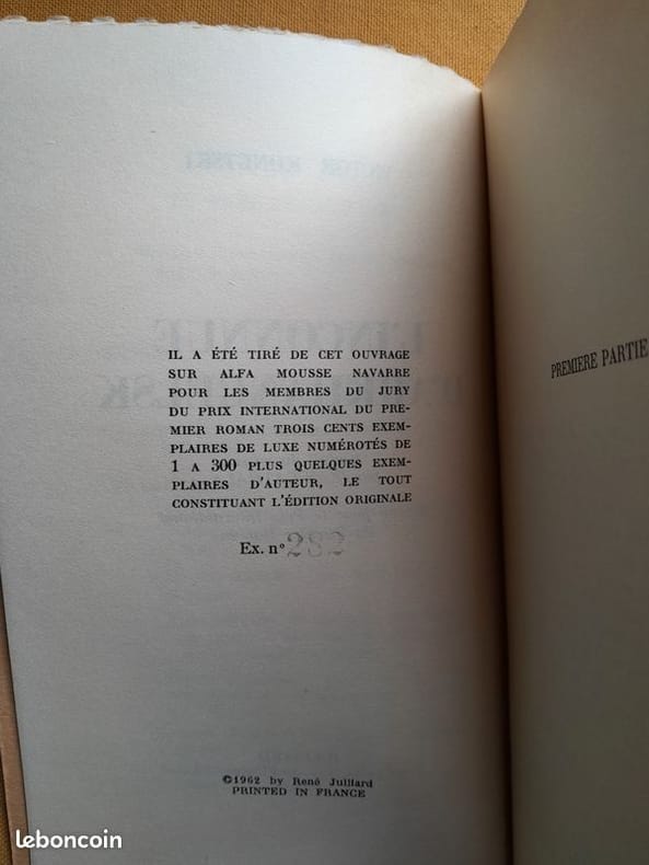 Paris René Julliard 1962 in 8 (21x13) 1 volume broché, 189 pages [1]. Collection du prix international du premier roman. Edition originale, celui-ci un des 300 exemplaires de luxe numérotés sur alfa mousse Navarre, réservés aux membres du Jury du Prix international du premier roman (seul grand papier). Bel exemplaire ( Photographies sur demande / We can send pictures of this book on simple request )