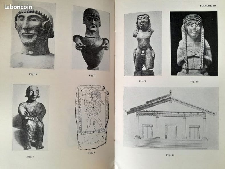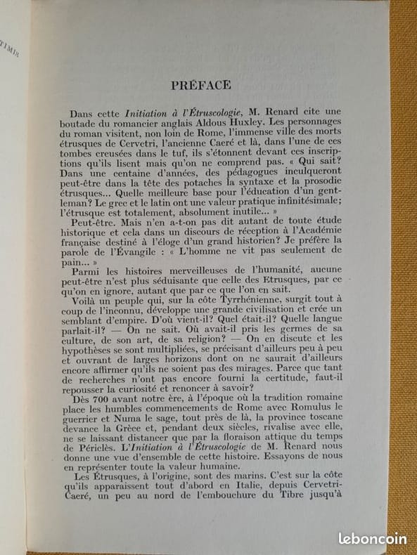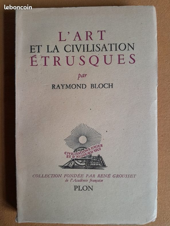 Jaquette et 1er plat déchirés en coiffe de queue ; reprise manuscrite au stylo du titre au dos de la jaquette, intérieur propre et frais. On joint en supplément "L'art et la civilisation étrusques" de Raymond Bloch.
