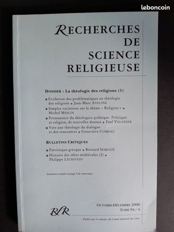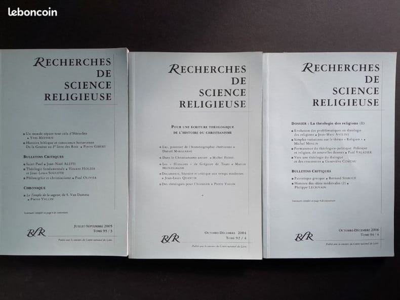 Paris, RSR/CNL, 2004-2006, in-8, br., pagination continue (env. 150 pp./n°). Contient : Pour une écriture théologique de l'histoire du christiannisme, tome 92/4 (oct./déc. 2004) – tome 93/3 (juill./sept. 2005) – Dossier : la théologie des religions (1), tome 94/4 (oct./déc. 2006).