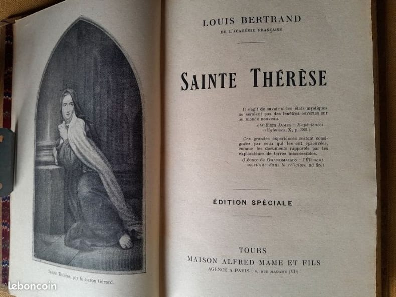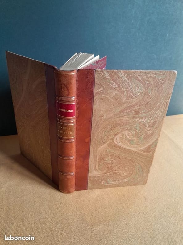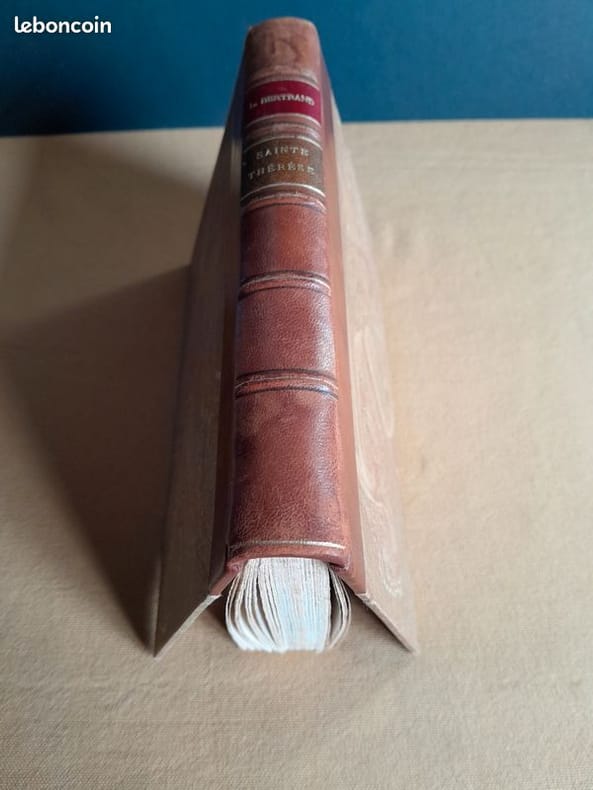 Tome I: (627pp )Vie de sainte Thérèse écrite par elle-même. Tome II: (596pp) Le Livre des fondations, Le livre des exclamations, Glose du Cantique de Sainte Thérèse, Avis de la sainte à ses religieuses. Tome III: (576pp) Le chemin de la perfection, Le château intérieur ou les demeures de l'âme. complet en trois vols reliés demi cuir, gd in8, 200x120, bel état intérieur, cachet du séminaire des missions, Montfort sur Meuse. Paris, Lecoffre et Cie, 1859 ref/117