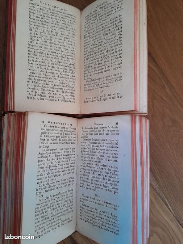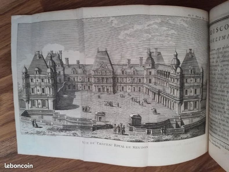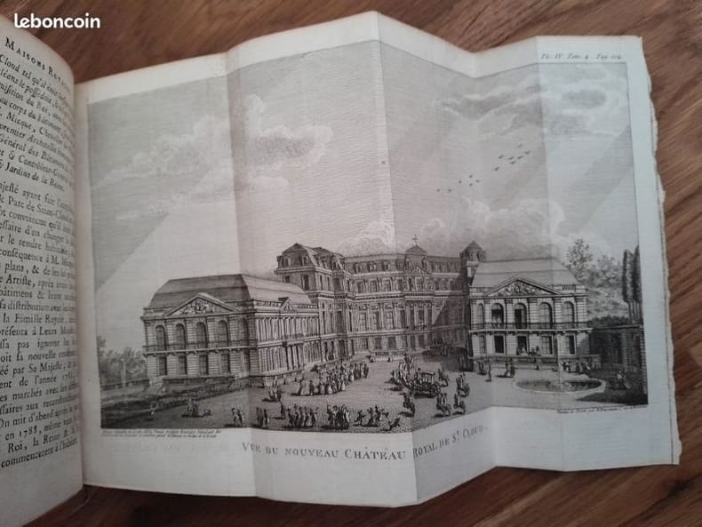 Paris, Nyon l'aîné, 1788-1789, 3 vols. in-12, reliés plein vélin, dos à 5 nerfs, caissons ornés de motifs végétaux, pièces de titres dorées, toutes tranches rouges, signet, XXII-329 ; LXXII-436 et 385 pp. Tome 1 : Vincennes et toutes ses dépendances [avec frontispice et deux planches dépliantes] – Tomes 3 & 4 : Saint Cloud et toutes ses dépendances, avec des figures gravées en taille douce [frontispice et 6 planches dépliantes]. Tome 4, 2e partie : Meudon et le château de Boulogne dit de Madrid.