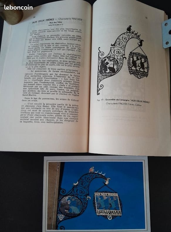 Charnière déchirée sur 2cm en coiffe de queue, plats légèrement salis, intérieur propre, frais et bien ferme. Contient 3 cartes postales récentes en couleurs reproduisant certaines des enseignes de Hansi.