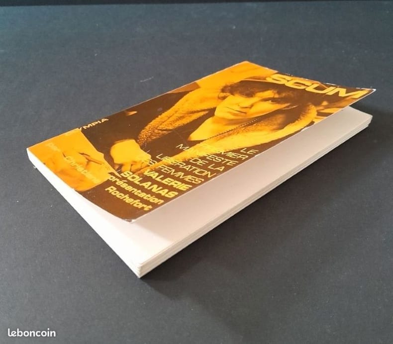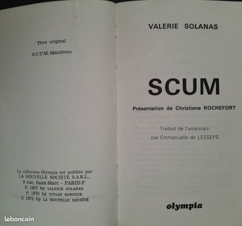 Édition originale de la traduction française établie par Emmanuelle de Lesseps . Bel et très rare exemplaire. Présentation de Christiane Rochefort. Discrimination de genre, discours de haine et appel au génocide, passage à l'acte avec une tentative de meurtre rageur, prémédité et sans repentir sur l'un des plus célèbres artistes du XXè, promotion d'une anarchie violente dans un grand rire scatologique, élimination ou humiliation programmée de la moitié du genre humain... Dans son pamphlet misandre, Scum manifesto («Society for Cutting Up Men»), Valerie Solanas ne témoigne d'aucune empathie, ne laisse aucune place à la modération ou à la réconciliation, n'accorde aucune exception à son projet de suppression de tous les hommes sinon pour «les hommes qui s'emploient méthodiquement à leur propre élimination [...] [comme] les travelos qui, par leur exemple magnifique, encouragent les autres hommes à se démasculiniser et à se rendre ainsi relativement inoffensif». Le premier manifeste du féminisme radical ne s'adresse pas qu'aux femmes, il englobe également dans son combat les identités sexuelles rejetées par la société phallocrate que Solanas veut mettre à bas avec une rage inédite pour un tel combat. «Life in this society being, at best, an utter bore and no aspect of society being at all relevant to women, there remains to civic-minded, responsible, thrill-seeking females only to overthrow the government, eliminate the money system, institute complete automation and destroy the male sex.» Introduction qu'en 1971, Emmanuèle de Lesseps, s'attelant à une version française, traduira par: «Vivre dans cette société, c'est au mieux y mourir d'ennui. Rien dans cette société ne concerne les femmes. Alors, à toutes celles qui ont un brin de civisme, le sens des responsabilités et celui de la rigolade, il ne reste qu'à renverser le gouvernement, en finir avec l'argent, instaurer l'automation à tous les niveaux et supprimer le sexe masculin.» À la fois programme politique insurrectionnel, délire paranoïaque et texte poétique, le manifeste de Solanas dérange par son refus de se laisser enfermer dans un genre, sérieux, utopiste ou satirique. Car la question que pose un tel ouvrage n'est peut-être pas celle de sa moralité, mais du droit de son autrice à revendiquer l'excès. Publié après sa tentative de meurtre sur Andy Warhol, le terrible manifeste de Solanas est l'affirmation littéraire et littérale que l'homme n'a pas le monopole de la violence. Bien qu'il s'offre comme un cri de colère rédigé dans l'urgence, SCUM est en réalité le fruit de deux années de réflexion et d'écriture avant d'être, à défaut d'éditeur, ronéotypé par Solanas en 1967 et vendu dans la rue (1 pour les femmes et 2 pour les hommes), sans rencontrer aucun succès. En quête de reconnaissance, Valérie Solanas évolue alors dans le milieu underground new-yorkais et se lie d'amitié avec le pape de la contre-culture, Andy Warhol, dont elle fréquente la Factory. À défaut de pouvoir faire éditer son manifeste, «le meilleur texte de toute l'histoire, qui ne sera surpassé que par mon prochain livre», Solanas s'attèle à sa première uvre littéraire: Up your Ass, une pièce de théâtre qu'elle veut faire produire par son mentor. Malheureusement, Warhol refuse la pièce et en égare l'unique manuscrit. En compensation, il offre à son amie un rôle dans deux de ses films. Solanas ne se satisfait pas de ce petit succès artistique et, le 3 juin 1968, fera feu à trois reprises sur Andy Warhol, blessant grièvement l'artiste et accédant du même coup à la célébrité. La jeune femme ne cache pas que son geste meurtrier, plus qu'une vengeance contre l'artiste, est surtout un acte politique et une nécessité artistique pour lui permettre de diffuser son uvre. Ainsi, interrogée sur les motivations de sa tentative criminelle, elle soumet à la justice et aux médias cette réponse laconique: «Lisez mon manifeste, vous saurez qui je suis». Maurice Girodias, le sulfureux éditeur d'Ol