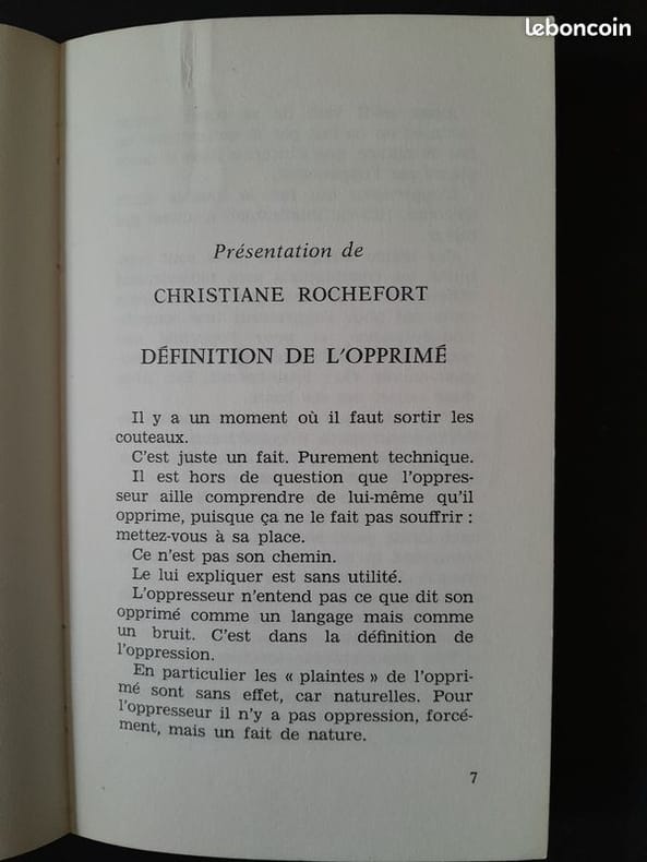 Paris, Olympia, 1971, 11x18 cm, 103 pp., broché sous couverture photographique. Édition originale de la traduction française établie par Emmanuelle de Lesseps. Présentation de Christiane Rochefort. Petites rayures au 1er plat, pli au dos, un nom au stylo bleu en page de garde, intérieur propre, ferme et intègre. Bel exemplaire peu commun de ce texte fondateur.