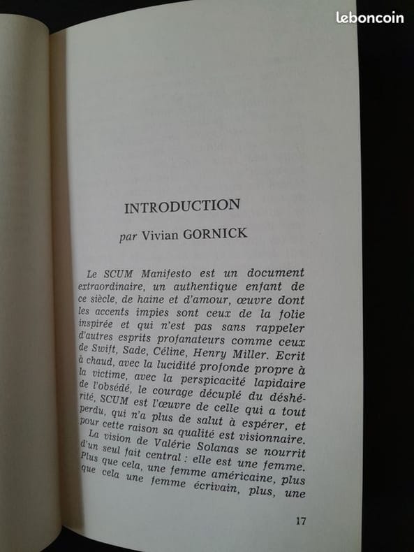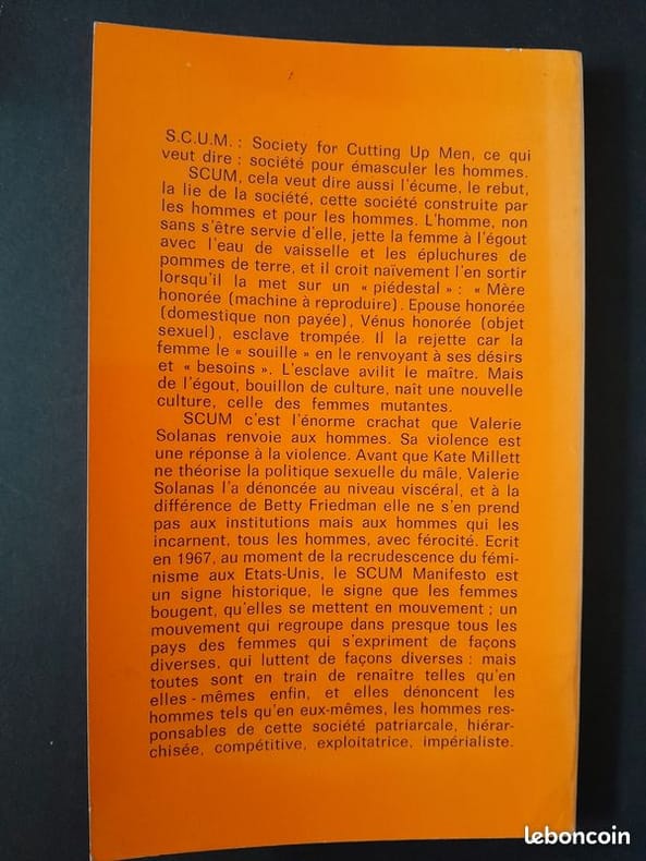 Discrimination de genre, discours de haine et appel au génocide, passage à l'acte avec une tentative de meurtre rageur, prémédité et sans repentir sur l'un des plus célèbres artistes du XXè, promotion d'une anarchie violente dans un grand rire scatologique, élimination ou humiliation programmée de la moitié du genre humain... Dans son pamphlet misandre, Scum manifesto («Society for Cutting Up Men»), Valerie Solanas ne témoigne d'aucune empathie, ne laisse aucune place à la modération ou à la réconciliation, n'accorde aucune exception à son projet de suppression de tous les hommes sinon pour «les hommes qui s'emploient méthodiquement à leur propre élimination [...] [comme] les travelos qui, par leur exemple magnifique, encouragent les autres hommes à se démasculiniser et à se rendre ainsi relativement inoffensif». Le premier manifeste du féminisme radical ne s'adresse pas qu'aux femmes, il englobe également dans son combat les identités sexuelles rejetées par la société phallocrate que Solanas veut mettre à bas avec une rage inédite pour un tel combat. «Life in this society being, at best, an utter bore and no aspect of society being at all relevant to women, there remains to civic-minded, responsible, thrill-seeking females only to overthrow the government, eliminate the money system, institute complete automation and destroy the male sex.» Introduction qu'en 1971, Emmanuèle de Lesseps, s'attelant à une version française, traduira par : «Vivre dans cette société, c'est au mieux y mourir d'ennui. Rien dans cette société ne concerne les femmes. Alors, à toutes celles qui ont un brin de civisme, le sens des responsabilités et celui de la rigolade, il ne reste qu'à renverser le gouvernement, en finir avec l'argent, instaurer l'automation à tous les niveaux et supprimer le sexe masculin.» À la fois programme politique insurrectionnel, délire paranoïaque et texte poétique, le manifeste de Solanas dérange par son refus de se laisser enfermer dans un genre, sérieux, utopiste ou satirique. Car la question que pose un tel ouvrage n'est peut-être pas celle de sa moralité, mais du droit de son autrice à revendiquer l'excès. Publié après sa tentative de meurtre sur Andy Warhol, le terrible manifeste de Solanas est l'affirmation littéraire et littérale que l'homme n'a pas le monopole de la violence. Bien qu'il s'offre comme un cri de colère rédigé dans l'urgence, SCUM est en réalité le fruit de deux années de réflexion et d'écriture avant d'être, à défaut d'éditeur, ronéotypé par Solanas en 1967 et vendu dans la rue (1$ pour les femmes et 2$ pour les hommes), sans rencontrer aucun succès. En quête de reconnaissance, Valérie Solanas évolue alors dans le milieu underground new-yorkais et se lie d'amitié avec le pape de la contre-culture, Andy Warhol, dont elle fréquente la Factory. À défaut de pouvoir faire éditer son manifeste, «le meilleur texte de toute l'histoire, qui ne sera surpassé que par mon prochain livre», Solanas s'attèle à sa première uvre littéraire: Up your Ass, une pièce de théâtre qu'elle veut faire produire par son mentor. Malheureusement, Warhol refuse la pièce et en égare l'unique manuscrit. En compensation, il offre à son amie un rôle dans deux de ses films. Solanas ne se satisfait pas de ce petit succès artistique et, le 3 juin 1968, fera feu à trois reprises sur Andy Warhol, blessant grièvement l'artiste et accédant du même coup à la célébrité. La jeune femme ne cache pas que son geste meurtrier, plus qu'une vengeance contre l'artiste, est surtout un acte politique et une nécessité artistique pour lui permettre de diffuser son œuvre. Ainsi, interrogée sur les motivations de sa tentative criminelle, elle soumet à la justice et aux médias cette réponse laconique: «Lisez mon manifeste, vous saurez qui je suis».