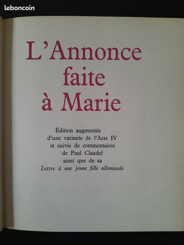 Le Club du meilleur livre, 1955, reliure d'éditeur avec rhodoïd, (20x17.5 cm), couverture illustrée, 319 pp., édition augmentée d'une variante de l'Acte IV et suivie de commentaires de Paul Claudel ainsi que de sa Lettre à une jeune fille allemande.