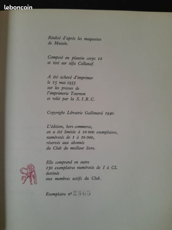 2026 2026. Très bon état. 1955 Club du meilleur livre. Ex Num n°6401/10000