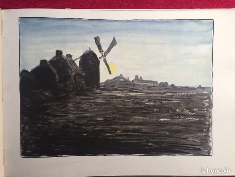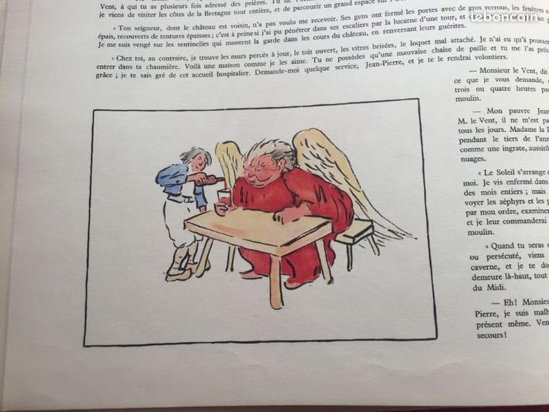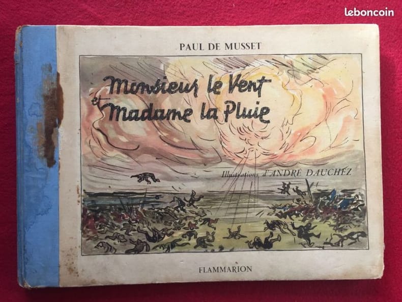 Premier tirage des délicates compositions à pleine-page et en couleurs d'André Dauchez. Lequel est ''avant tout le traducteur intelligent de la rude et si caractéristique Bretagne. Il débuta dans la gravure par des planches de traduction jusque 1895, date à laquelle la peinture l'attirant tout spécialement, il s'attacha à la Bretagne''. (Delteil). ''Il exécuta de nombreuses eaux-fortes et illustra quelques livres (notamment, l'année de sa mort, Monsieur le Vent et Madame la Pluie''. (in Osterwalder). ''Dauchez travailla sans maître et étudia uniquement d'après nature''. (in Bénézit). ''Jean-Pierre, le meunier, n'a pour tout bien que son moulin et son jardin potager. Mais jamais le vent ne fait tourner les ailes du moulin, et jamais la pluie ne fait pousser les légumes du jardin... jusqu'à ce qu'une nuit, M. le Vent et Mme la Pluie viennent se reposer dans la maison toute trouvé du meunier... Pour le remercier de son hospitalité, ils lui offrent dieux objets magiques qui vont susciter la jalousie du terrible seigneur du château...'' Osterwalder II, Dictionnaire des illustrateurs, p. 286 - Bénézit III, Dictionnaire des peintres, p. 373. Angles et coupes élimés. Petites tâches affectant le premier plat. Belle condition intérieure.