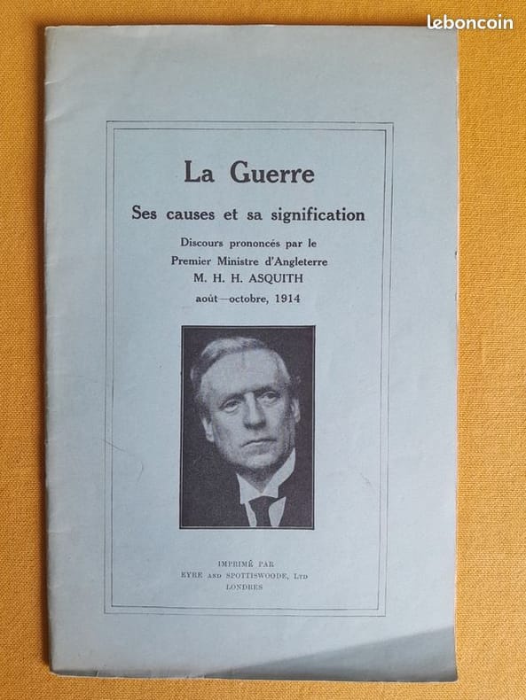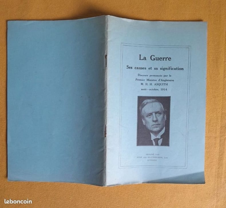 London, Eyre and Spottiswoode, 1914, in-8, brochure agrafée, 39 p. Discours prononcés par le Premier Ministre d'Angleterre M.H.H. Asquith d’août à octobre 1914.