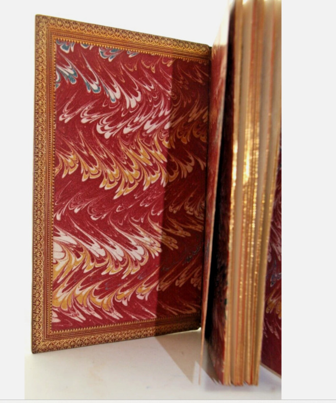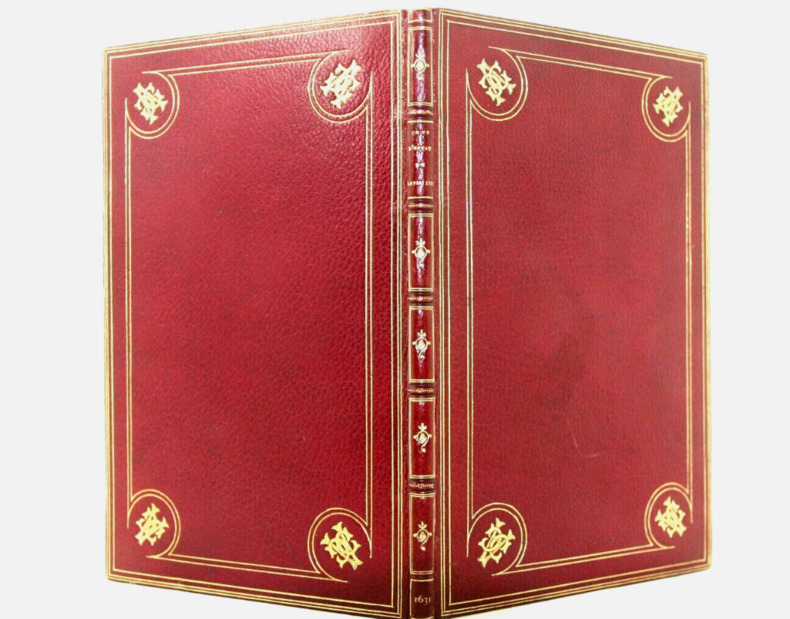 Plein maroquin, monogramme à identifier dans les coins des plats. Quadruple filets, dos à nerfs orné de fleuron, titre et auteur. Double pages de garde colorées. Dentelle sur les contre-plats, signature de Chatelin. In-8° [ signature B en p. 17] à la typographie plus petite que l'édition originale (qui contient 95 p.) , vraisemblablement contrefaçon. Tranches finement dorées sur fond rouge