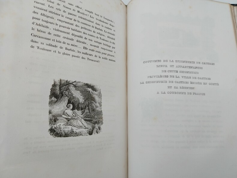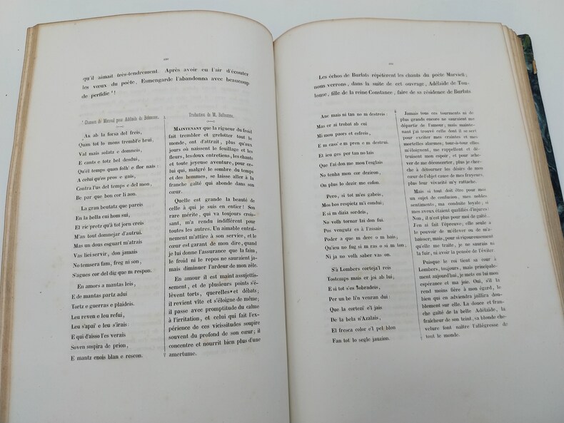In-8° demi veau bleu sombre, dos long, excellent état. Un frontispice, 7 gravures hors texte, multiples en-tête et culs de lampe, texte de la chanson d'Adélaïde en occitan. Rousseurs essentiellement sur les gravures