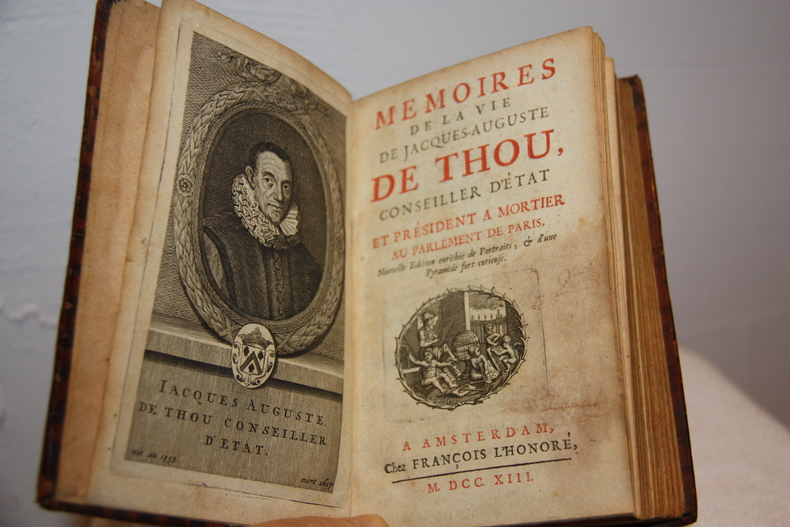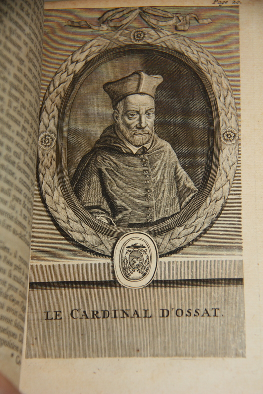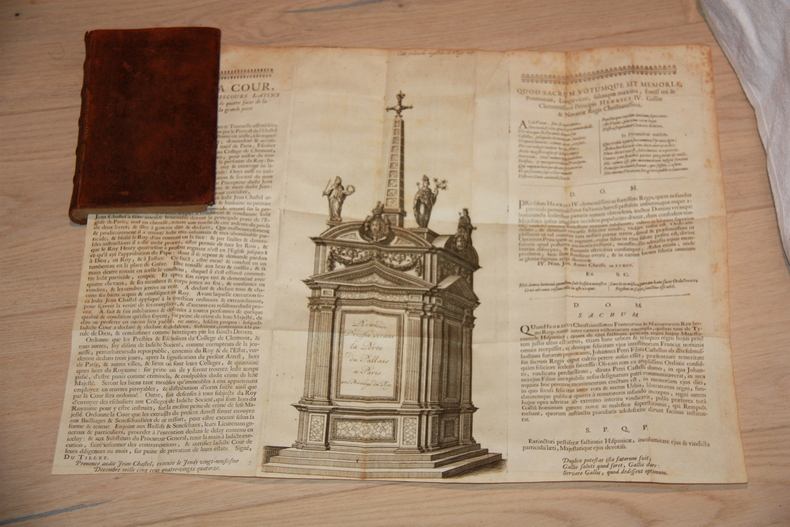 Exemplaire complet des six portraits (souvent celui de Montaigne est en déficit) : De Thou (Frontispice), Scaliger p.9, Le Fèvre p.11, d'Ossat p. 20 ,Pithou p.100, Montaigne p.180 . La planche dépliante représentant et commentant la pyramide commémorative contre Châtel est p.218