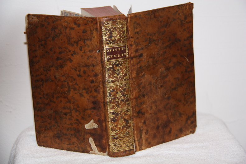 In-12° pleine basane en partie épidermée, manque de cuir sur plat verso, coins émoussés, coiffes tranchefiles et charnières parfaites. Reliure XVIIIe avec tranches rouges. Annotations manuscrites sur la page de titre. 1671 à l'encre en fin de volume. Aucune rousseur. Dos long à fleurons. PIèce de titre Titre-9 ff°-288 p. -21 ff°