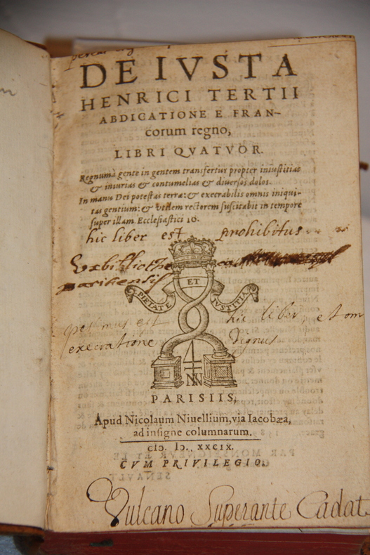 Intéressant privilège accordé par le duc de Mayenne, lieutenant général du royaume. Les annotations manuscrites rappellent l'interdiction du livre et l'horreur de la justification du régicide.