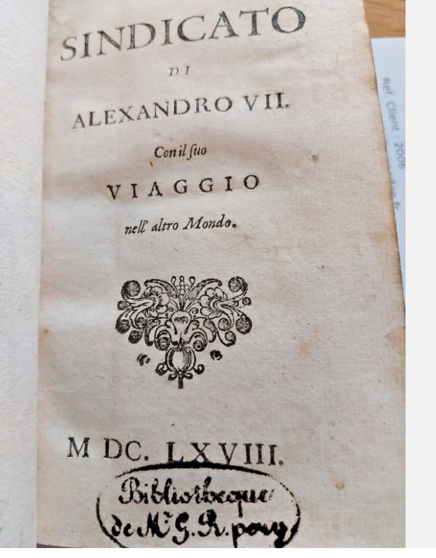 Edition originale du pamphlet de Gregorio Leti contre la famille Chigi. Une traduction française parut en 1669 Gregorio Leti (1630-1701), neveu d'un évêque italien, fuit son pays en 1658 pour se réfugier à Genève où il embrassa la religion protestante. Exemplaire aux armes, non déterminées.