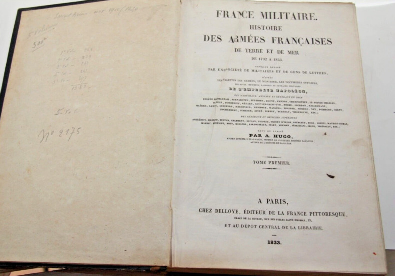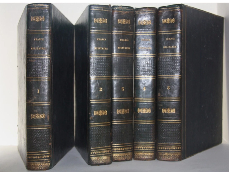Tome 1 : 1833 ; 268 cartes, plans , vignettes et portraits [énumérés sur la table p.III et IV] , VIII- 312 p. [contient l'Insurrection de Corse] Tome 2 : 1835 ; 239 cartes, plans , vignettes et portraits [énumérés sur la table p.III et IV] , VIII- 320 p. [contient campagnes d'Italie] Tome 3 : 1836 : 263 cartes, plans , vignettes et portraits [énumérés sur la table p.III et IV] , VII-1 -320 p.[contient campagne de Moravie (Austerlitz) Tome 4 : 1837 : 263 cartes, plans , vignettes et portraits [énumérés sur la table p.III et IV] , VIII -319 p. -1[contient campagne de Pologne 1807] Tome 5 : 1838 : 268 cartes, plans , vignettes et portraits [énumérés sur la table p.III et IV] , VII-1-368 p. [contient conquête de l'Algérie] Les tomes sont constitués de livraisons périodiques à pagination continue avec un texte sur deux colonnes. Un classique longtemps utilisé comme référence. Rare sans rousseur.