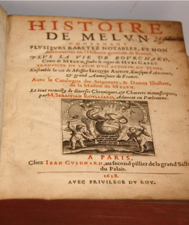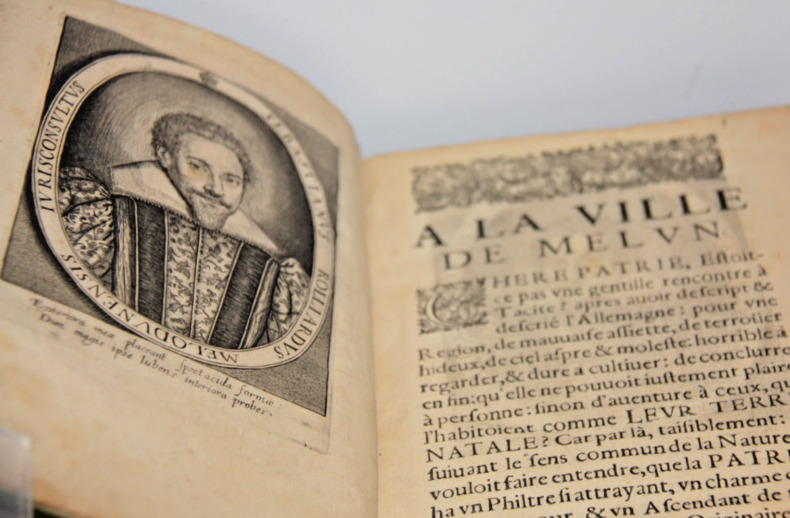 Marque d'imprimeur " Nous brulons le monde, en bruslant je vis pour le conserver". Portrait de S. Rouillard. Très bel exemplaire et est-il besoin de le préciser ? la couleur verte du parchemin ne contient aucune trace d'arsenic....