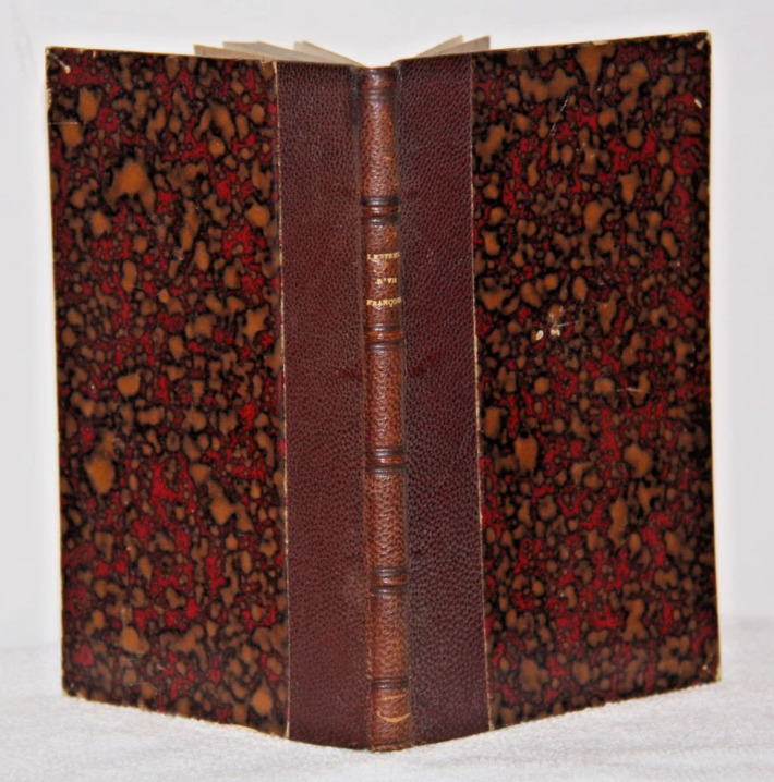 Pliage en in-4°, mais dimensions d'un in-16. Demi chagrin à nerfs chocolat, Titre frappé au dos, reliure XIX e siècle. Coins renforcés. Parfait état. Page de titre légèrement salie, traces marginales d'un démontage (pour faire une nouvelle reliure ?). Tâche oxydée sur le titre. Complet 112p.