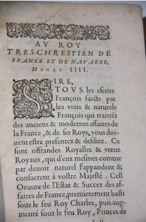 Epître dédicatoire à Henri IV du 15 octobre 1594, épître dédicatoire à Henri III (avril 1580) et préface au lecteur. Texte régulièrement édité de 1570 à 1611.