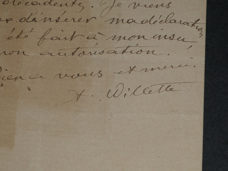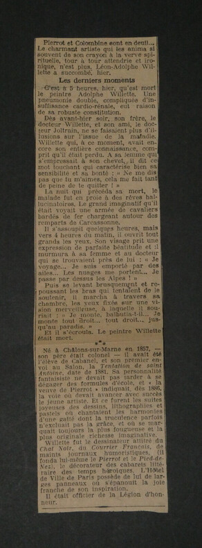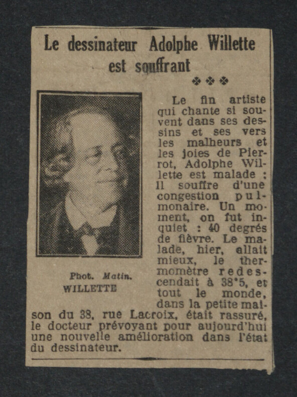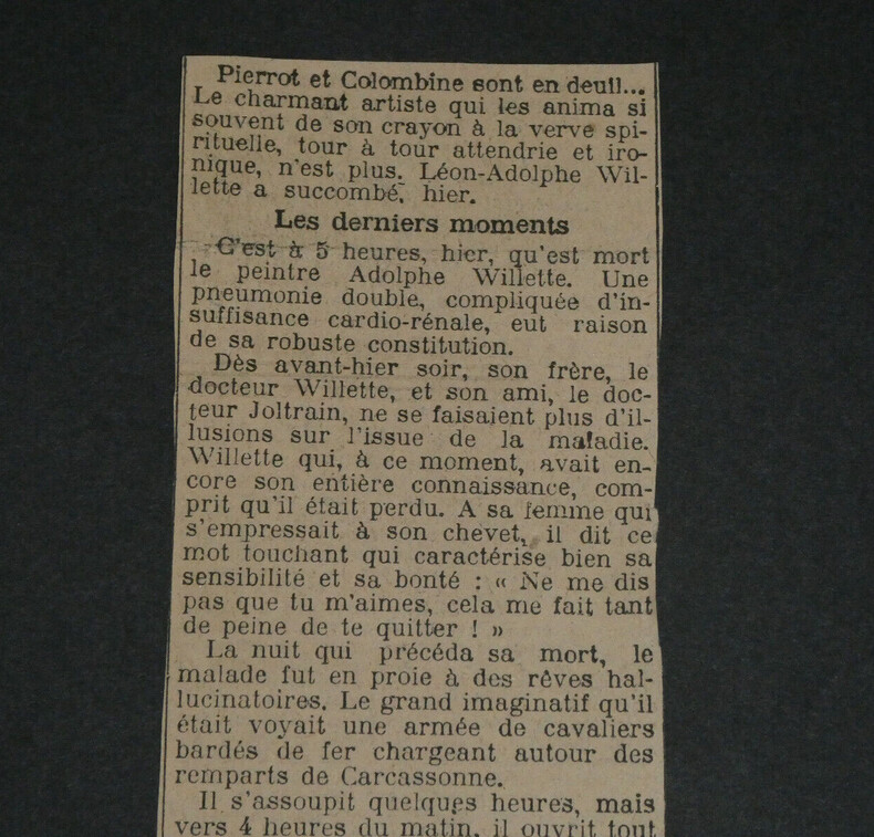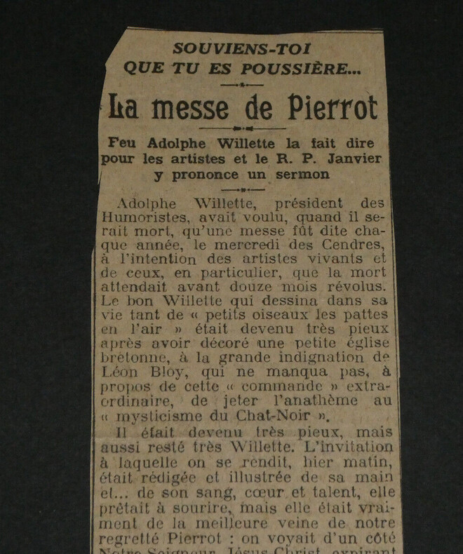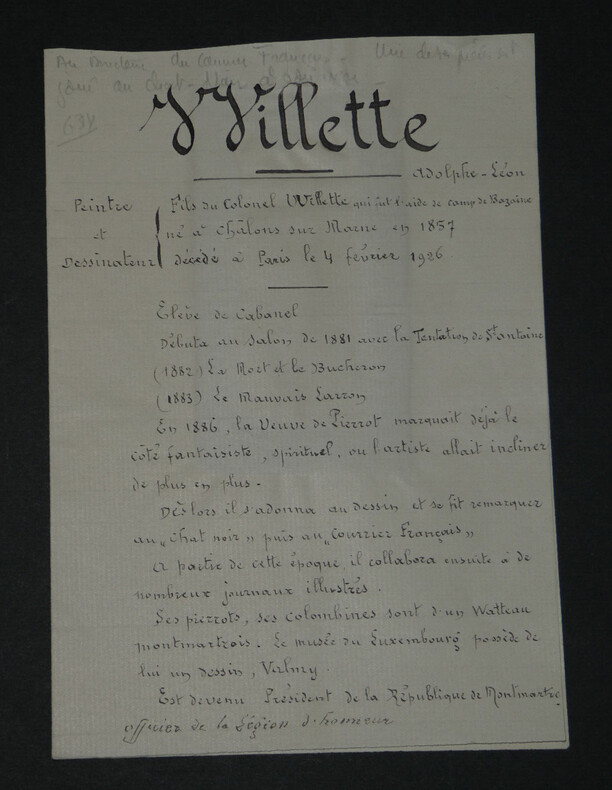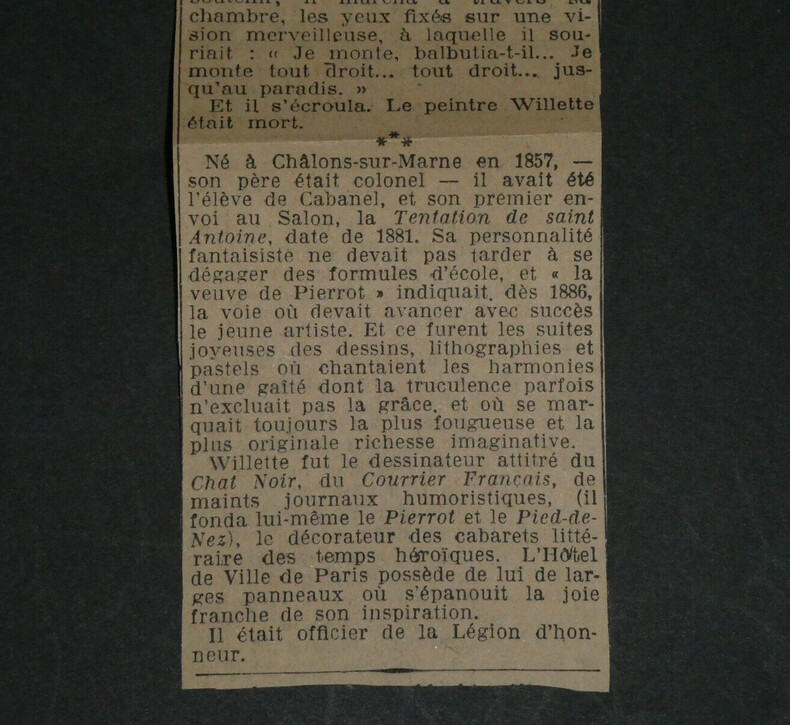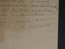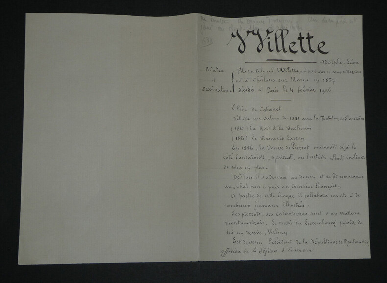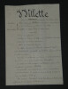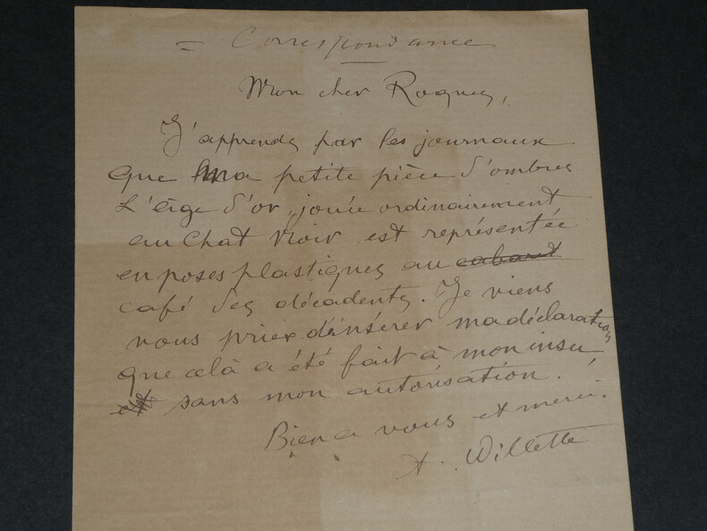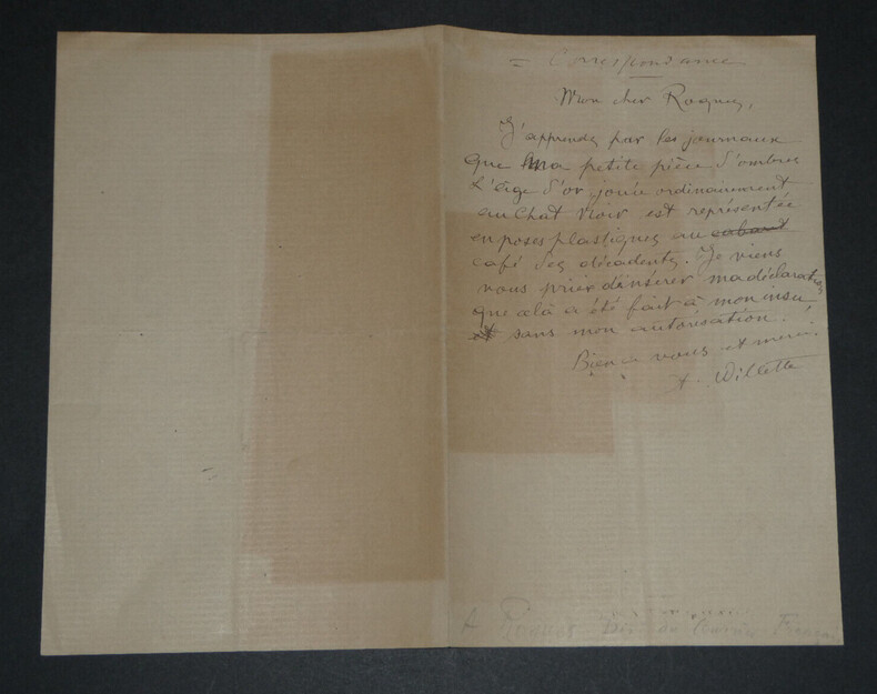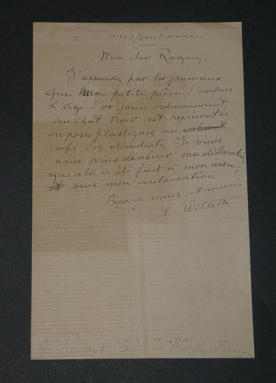 Adolphe Léon Willette - LETTRE AUTOGRAPHE SIGNÉE À Jules Roques, "L'Age d'Or" et petits papiers Peintre français Lettre autographe signée à Jules Roques Directeur du courrier français. Sont joints deux articles de Journaux d'époque relatifs au décès de Willette en 1926 et une belle fiche d'un Collectionneur avec une photo de presse au dos. "Mon cher Roques, J'apprends par les journaux que ma petite pièce d'ombre L'Age d'or, jouée ordinairement au Chat noir est représentée en poses plastiques au café des décadents. Je viens vous prier d'insérer ma déclaration que cela a été fait à mon insu sans mon autorisation. Bien à vous et merci." L'Age d'or, pièce d'Ombres par Willette est éditée en 1893 et jouée à cette même période au Chat Noir puis au Café des décadents. * Dimensions : 21,1 x 13,4 cm * État : Voir photos pour plus de détails. * Nombre de pages : 1 page Adolphe Léon Willette Adolphe Léon Willette, né le 30 juillet 1857 à Châlons-sur-Marne et mort le 4 février 1926 à Paris, est un peintre, illustrateur, affichiste, lithographe et caricaturiste français. Wikipédia Contactez-nous Lettres autographes, vieux papiers, livres anciens, photographies, gravures, timbres... Nous expertisons et/ou rachetons dans toute la France vos lettres, collections de lettres et livres anciens. Caractéristiques spéciales: Manuscrit, Signé, lettre autographe Auteur: Adolphe Léon Willette Langue: Français Époque: XIXème Sujet: Art Pays d'origine: France métropolitaine