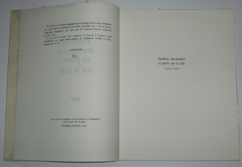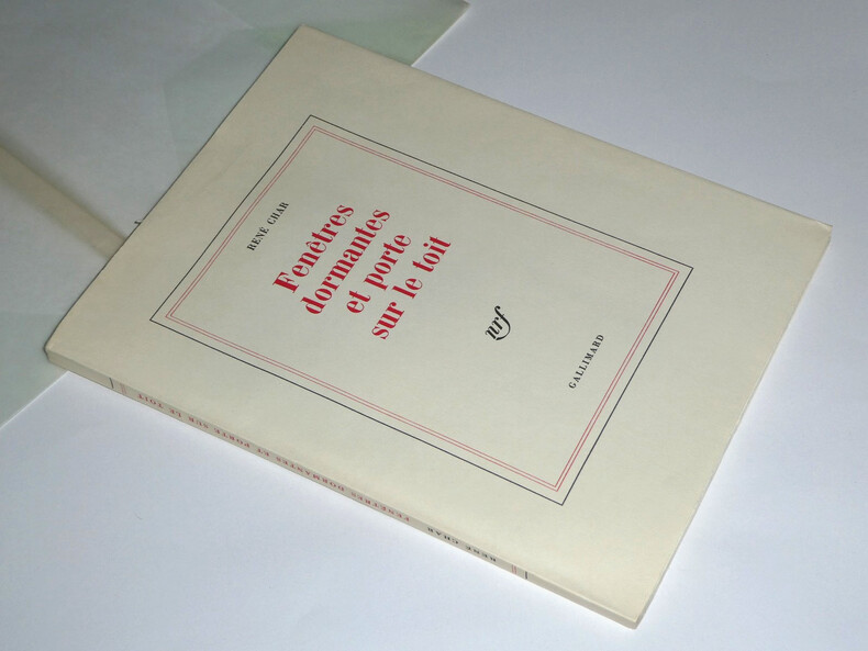 RENE CHAR - Fenêtres dormantes et porte sur le toit - EO 1/85 sur Vélin NRF 1979 * Auteur : René Char* Titre : Fenêtres dormantes et porte sur le toit* Édition : Gallimard, Éditions de la Nouvelle Revue Française (nrf), Paris, 1979* Tirage : Édition originale. L'un des 85 exemplaires numérotés sur vélin pur fil Lafuma-Navarre (après 35 exemplaires sur vergé de Hollande). Exemplaire n° 118.* Reliure : Broché, sous couverture rempliée de l'éditeur avec une protection de papier cristal. Volume avec marges non coupées .* Dimensions : 19,3 x 24,7 cm* État : Excellent état. Exemplaire très frais, papier bien blanc, couverture parfaitement conservée sous son cristal. Dos non cassé, mors et coiffes intacts.* Nombre de pages : 95 pages