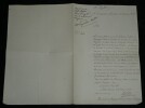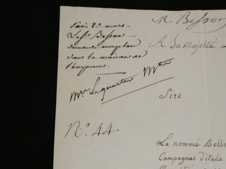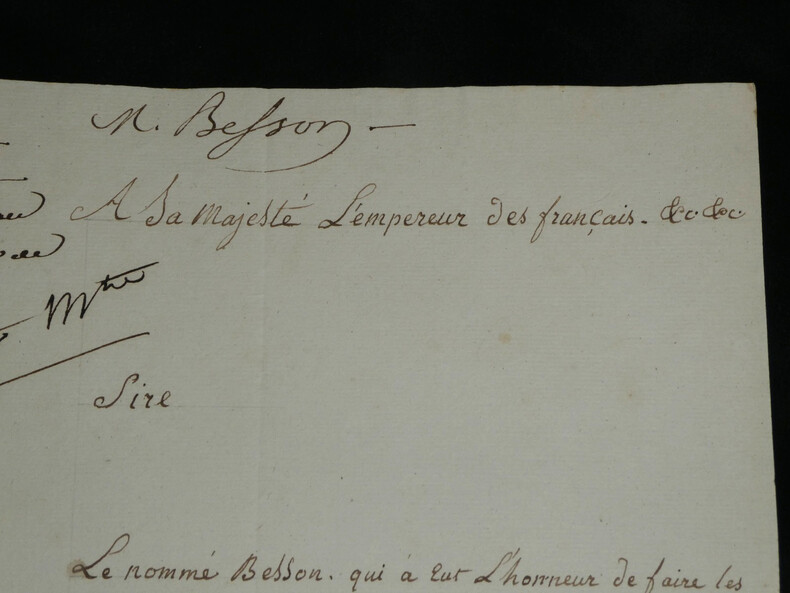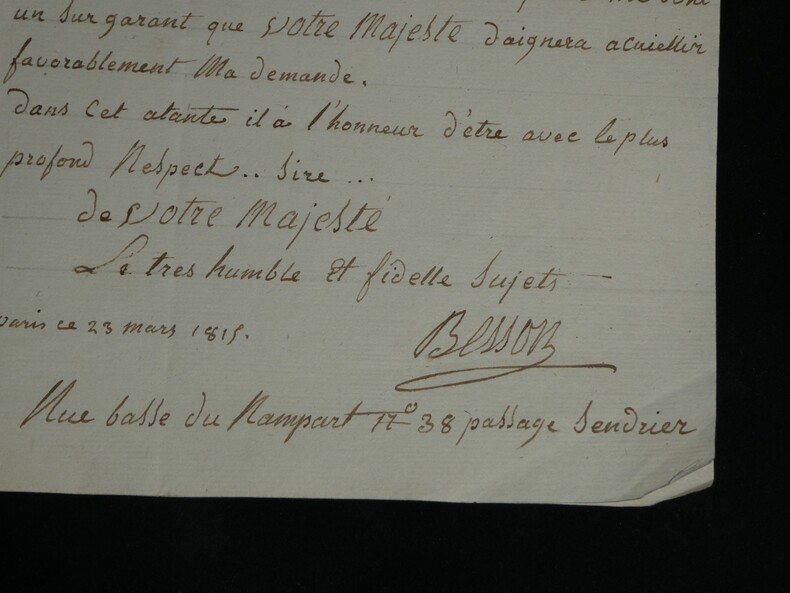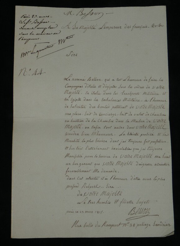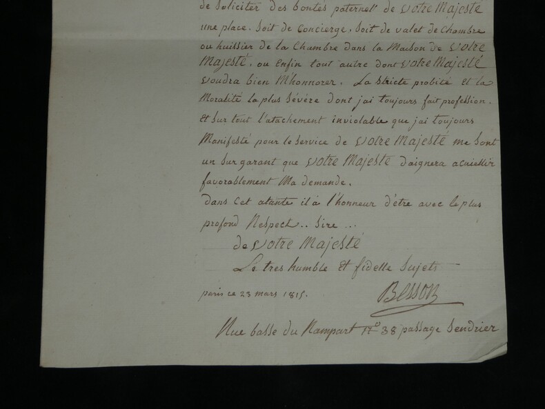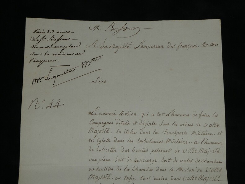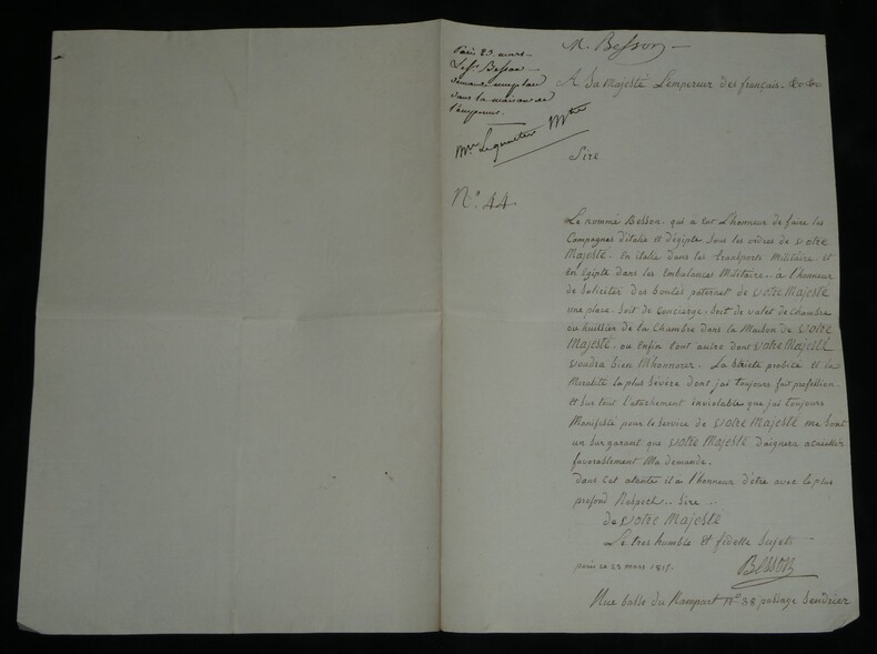 Lettre signée à Napoléon 1er, Vétéran D'Égypte & Italie, Ambulance 23 mars 1815 Lettre signée adressée à Sa Majesté l'Empereur des français, Napoléon 1er , datée du 23 mars 1815 à Paris . Rédigée à l'encre brune sur un double feuillet de papier vergé filigrané. Ce document, rédigé trois jours seulement après le retour de Napoléon aux Tuileries, est émouvant par la qualité de son signataire. Le sieur Besson n'est pas un courtisan ordinaire, c'est un compagnon de la première heure. Il sollicite un poste dans la Maison de l'Empereur (Concierge, Valet ou Huissier) en faisant valoir des états de service prestigieux : il a participé aux campagnes d'Italie (dans les transports militaires) et surtout à la campagne d'Égypte, précisant avoir servi dans les "Ambulances Militaires". C'est un témoignage superbe de la fidélité des "vieilles moustaches" qui, dès le retour de l'Empereur de l'île d'Elbe, accourent pour reprendre du service, forts de leur légitimité historique acquise sous le Directoire et le Consulat. Transcription du document : « A Sa Majesté l'Empereur des Français Sire, Le nommé Besson qui a eut L'honneur de faire les Campagnes d'italie et d'egipte sous les ordres de Votre Majesté. En italie dans les transports militaire et en egipte dans les Embulances Militaire.. à l'honneur de solicité des bontés parternels de Votre Majesté une place. soit de concierge. soit de valet de chambre ou huissier de la Chambre dans la maison de Votre Majesté, ou enfin tout autre dont Votre Majesté voudra bien M'honnorer. La stricte probité et la moralité la plus sévère dont j'ai toujours fait profession. Et sur tout l'atachement inviolable que j'ai toujours manifesté pour le service de Votre Majesté me sont un sur garant que Votre Majesté daignera acuiellir favorablement ma demande. Dans cet atante il a l'honneur d'être avec le plus profond respect.. Sire... Le tres humble et fidelle sujets paris ce 23 mars 1815 » Dimensions : 31,2 x 20,6 cm État : Voir photos et description pour plus de détails. Nombre de pages : 1 page Ce document provient d'un ensemble de correspondances adressées au c ur du pouvoir impérial entre 1808 et 1815.