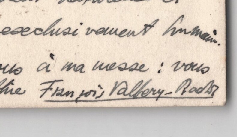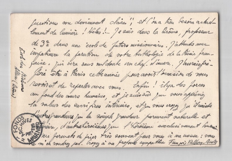 Père François Vallery-Radot. Carte lettre autographe signée à Thierry Maulnier, Allex, 1939 Médecin et chimiste français Carte lettre autographe signée de François Vallery Radot , adressée à Thierry Maulnier, datée du 10 avril 1939 à Allex. Rédigée à l'encre noire. Avec tampon des Archives Privées Thierry Maulnier. Superbe lettre de soutien intellectuel et spirituel écrite quelques mois avant le déclenchement de la Guerre de 39-45. Le Père Vallery-Radot, alors professeur chez les Missionnaires à Allex, félicite Thierry Maulnier pour son article prophétique : « La guerre ? peut-être, encore faut-il savoir pourquoi ». Il lui écrit : "Allex le 10 avril 1939. Cher monsieur et ami, Je prends occasion de votre tout récent article de combat : « La guerre ? peut-être, encore faut-il savoir pourquoi », pour vous exprimer encore une fois l’admiration que j’ai pour vous et le réconfort intellectuel et moral que constitue pour moi tout ce que vous écrivez. Je dis toujours : « Quand j’ai lu Thierry Maulnier, toutes les questions me deviennent claires » ; et l’on a bien besoin actuellement de lumière ! Hélas !... Je suis dans la Drôme, professeur de 3e dans une école de futurs missionnaires. J’attends avec impatience la parution de votre Anthologie de la Poésie française, qui sera sans nul doute un chef-d’œuvre. J’aurais préféré être à Paris cette année pour avoir l’occasion de vous revoir et de reparler avec vous. Enfin ! il y a des forces au fond des cœurs humains, et je suis sûr que vous appréciez la valeur des sacrifices intérieurs, et que vous croyez qu’il existe d’autres grandeurs que la simple grandeur purement naturelle et extérieure, d’autres héroïsmes que l’héroïsme exclusivement humain. Je me permets de prier très souvent pour vous à ma messe : vous ne m’en voudrez pas. Croyez à ma profonde sympathie" Dimensions : 14 x 9 cm État : Traces d'onglet au dos de la lettre. Voir photos et description pour plus de détails. Nombre de pages : 2 page