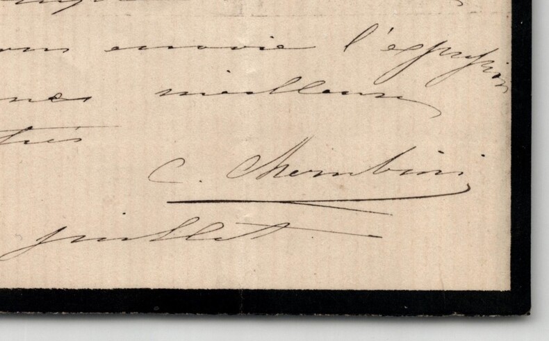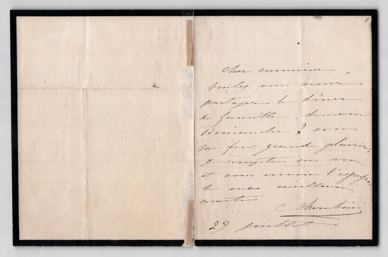 Carlo Chérubini. Lettre autographe signée d'invitation à diner, 1936 Peintre italien Lettre autographe signée de Carlo Chérubini, datée du 29 juillet sans année, écrite à l'encre noire sur un double feuillet de papier vergé avec liseré de deuil de 3 mm. « Cher monsieur, Voulez vous venir partager le dîner de famille, demain Dimanche ? Vous me ferez grand plaisir, je compte sur vous et vous envoie l'expression de mes meilleures amitiés. » Rappel dimensions : 10,2 x 13,2 cm État : Voir photos pour plus de détails. Nombre de pages : 1 page