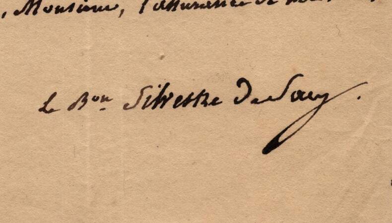 Baron Antoine-Isaac Silvestre de Sacy. Lettre autographe signée, 1833 Grammairien, philologue et un orientaliste-arabisant français Lettre autographe signée d' Antoine-Isaac Silvestre de Sacy, datée du 12 décembre 1833. Rédigée à l'encre brune sur un feuillet de papier vélin avec tampon sec. Le Baron Silvestre de Sacy intervient en tant que protecteur et homme d'influence sous la Monarchie de Juillet. Il sollicite un "secours" (aide financière) pour une Madame Lemonnier et relance une demande auprès d'un Ministre pour l'admission d'une protégée (Mademoiselle Magny) à l'Hospice des Incurables (actuel Hôpital Laennec à Paris). Cette missive illustre parfaitement le rôle social des hauts dignitaires de l'époque, servant de relais entre les nécessiteux et l'administration royale à l'approche de l'hiver. « Monsieur, Vous aviez eu la bonté de me faire espérer un secours pour Mad. Lemonnier que j'ai eu l'honneur de vous recommander. Je prends la liberté de vous le rappeler, parce que cette saison en rend le besoin plus sensible. Permettez-moi aussi de vous rappeler la demande que j’ai présentée au Ministre, il y a au moins six mois, d’une place aux Incurables, femmes, pour Mad.elle Magny. Vous m’aviez fait espérer qu’elle pourrait obtenir cette faveur dont elle a le plus grand besoin avant l’hiver. J’ai eu l’honneur de vous remettre les pièces nécessaires à l’appui de cette demande. Veuillez, je vous prie, vous les faire représenter. Agréez, je vous prie, Monsieur, l’assurance de ma haute considération. » Dimensions : 15 x 20,5 cm État : Voir photos et description pour plus de détails. Nombre de pages : 1 page Antoine-Isaac Silvestre de Sacy Antoine-Isaac, baron Silvestre de Sacy, né le 21 septembre 1758 à Paris où il est mort le 21 février 1838, est un grammairien, philologue et un orientaliste-arabisant français.