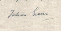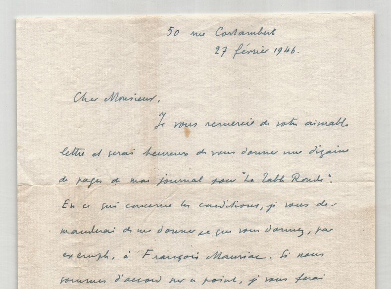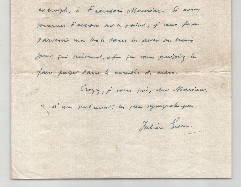 Julien Green. Lettre autographe signée, 1946 Écrivain, auteur dramatique et romancier Lettre autographe signée de Julien Green, datée du 27 février 1946. Rédigée à l'encre bleue sur un feuillet de papier vergé fin. Lettre d’intérêt littéraire, adressée très probablement à Thierry Maulnier, dans laquelle Julien Green accepte de fournir une dizaine de pages de son Journal pour la revue La Table Ronde, au cœur de sa production d’après-guerre. Il demande que les conditions de rémunération soient alignées sur celles accordées à François Mauriac et propose d’envoyer son texte dans les jours suivants pour parution dans le numéro de mars. « Cher monsieur, Je vous remercie de votre aimable lettre et serai heureux de vous donner une dizaine de pages de mon journal pour "La Table Ronde". En ce qui concerne les conditions, je vous demanderai de me donner ce que vous donnez, par exemple, à François Mauriac. Si nous sommes d'accord sur ce point, je vous ferai parvenir mon texte dans les deux ou trois jours qui suivront, afin que vous puissiez le faire passer dans le numéro de mars. Croyez, je vous prie, cher Monsieur, à mes sentiments les plus sympathiques. » Lettre intéressante pour l’histoire éditoriale du Journal de Julien Green et pour les relations entre l’auteur et l’équipe de La Table Ronde au lendemain de la guerre. Dimensions : 18,5 x 26,6 cm État : Voir photos et description pour plus de détails. Nombre de pages : 1 page