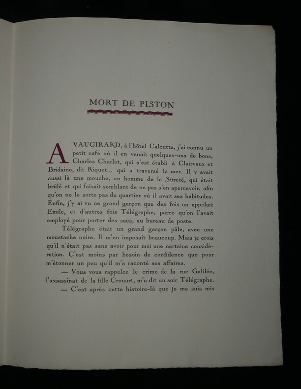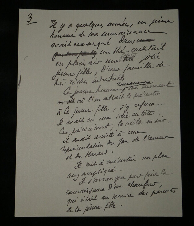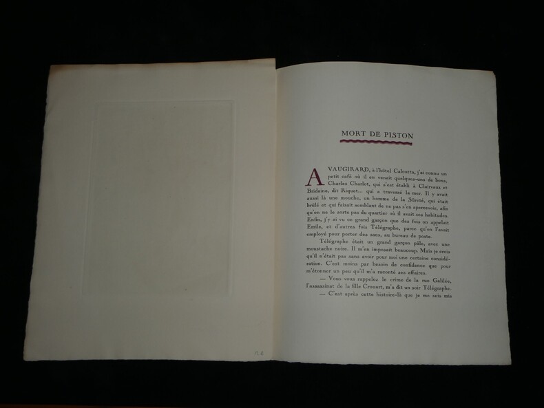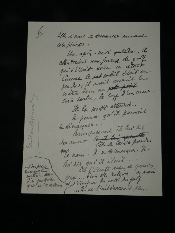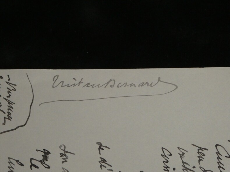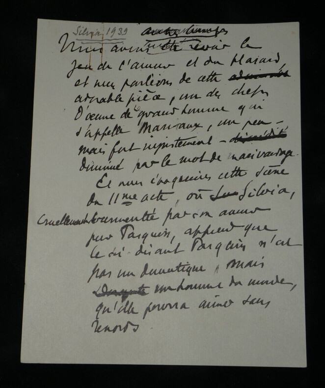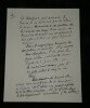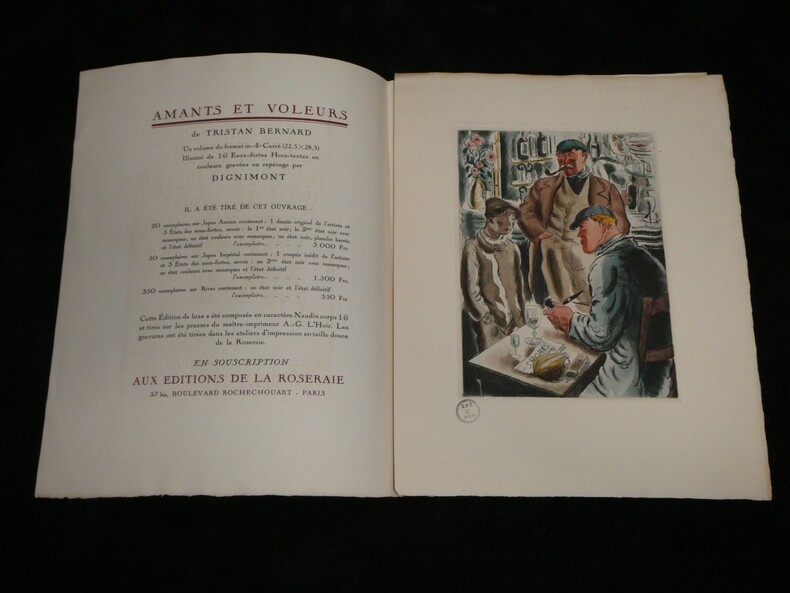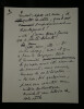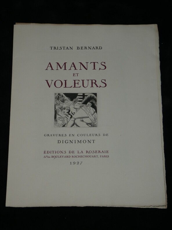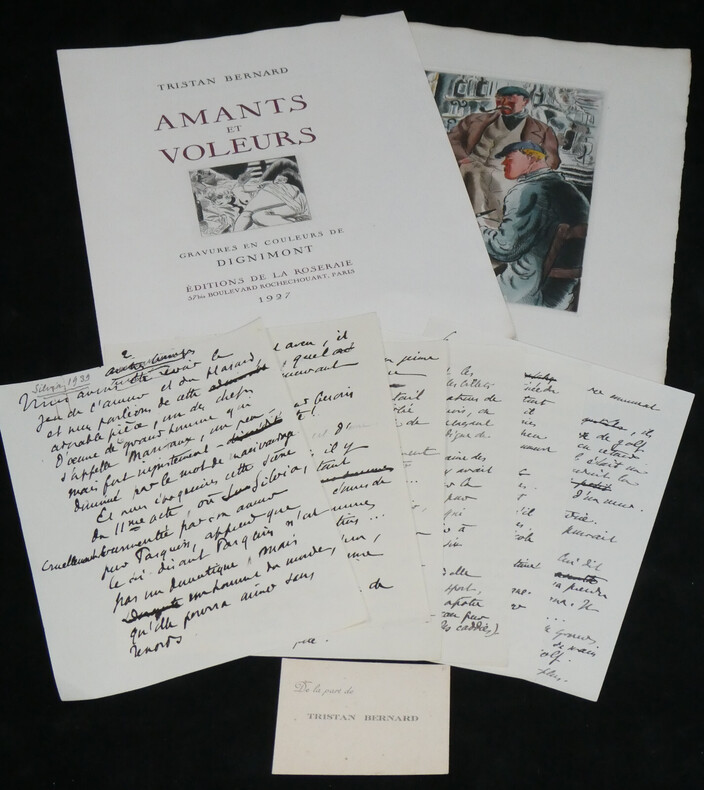 Tristan BERNARD. Manuscrit autographe signé de 6 pages, livret de souscription d' "Amants et voleurs" avec une gravure en couleur et une carte de visite Écrivain Manuscrit autographe signé de Tristan BERNARD "Amants et Voleurs", écrit à l'encre noire sur 6 feuillets de papier vélin. Il parle de l'histoire d'amour narrée dans la pièce de théâtre de Marivaux "Le jeu de l'amour et du hasard" de 1730, puis raconte une histoire d'amour d'une Silvia de son siècle. Joint un livret d'achat par souscription de son livre "Amants et voleurs" édition de 1927 avec une gravure couleur, et une carte de visite. Tampons de collection : "Des archives et collections de J.L. DEBAUVE". Dimensions : Manuscrit : 15,1 x 19,4 cm ; Carte de visite : 8 x 5,9 cm ; livret : 22,5 x 28,4 cm ; gravure : 22,9 x 28,6 cm État : Voir photos et description pour plus de détails. Nombre de pages : 6 pages