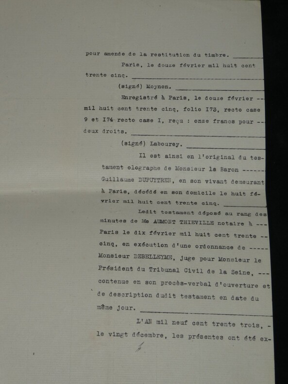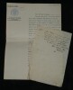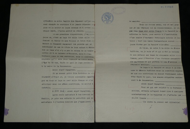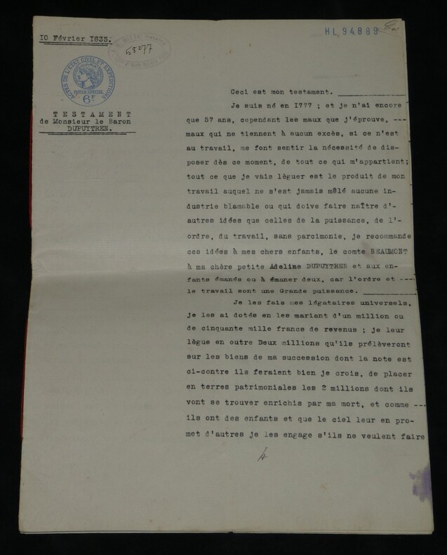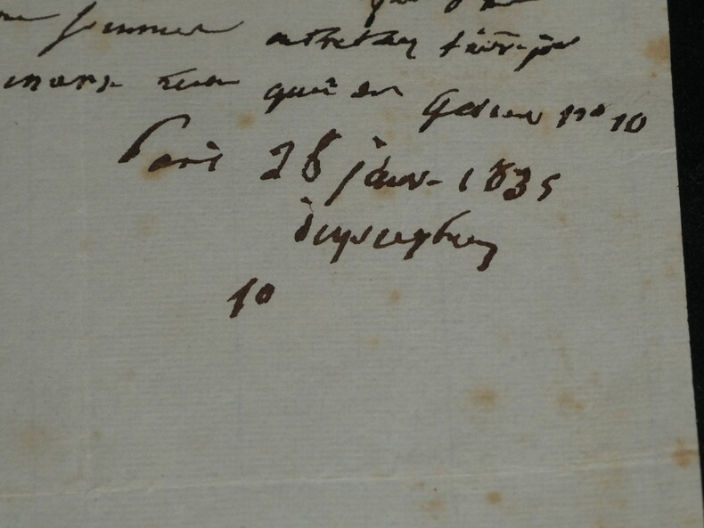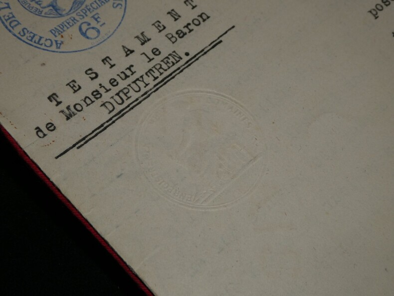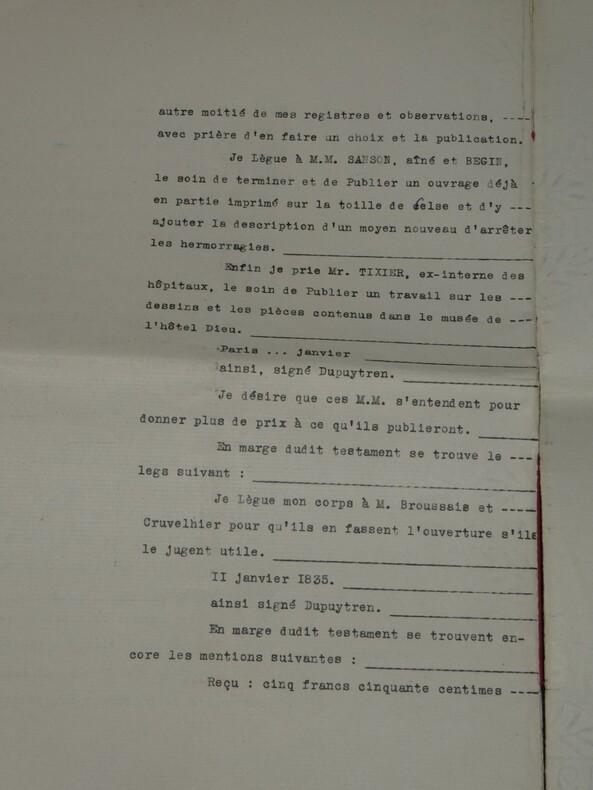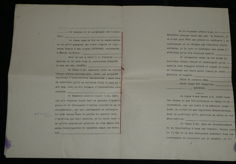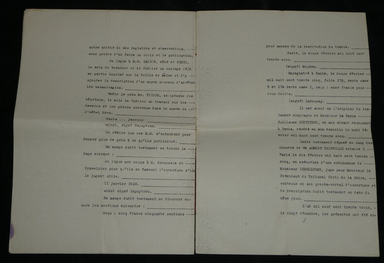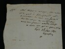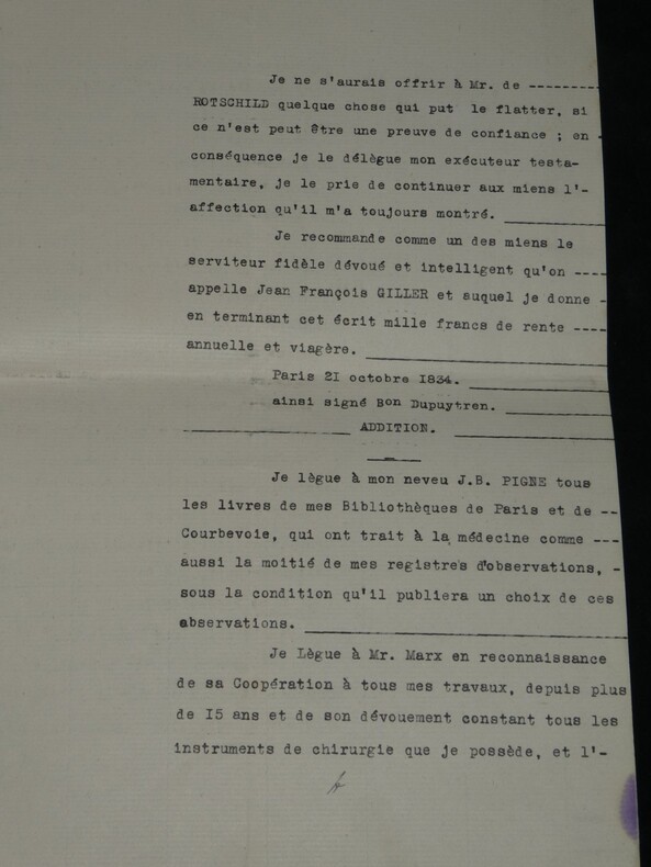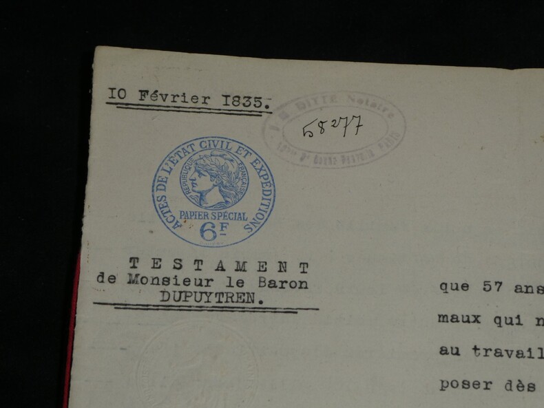 Guillaume Dupuytren. Note autographe signée 13 jours avant son décès et une réédition officielle de son testament, 1835 Anatomiste et chirurgien français Note autographe signée de Guillaume Dupuytren, datée du 26 janvier 1835, soit seulement 13 jours avant son décès. Rédigée à l'encre brune sur un feuillet de papier vergé filigrané d'une écriture désarticulée. Cette pièce présente un intérêt biographique exceptionnel pour l’histoire de la médecine. Datée du 26 janvier 1835, elle est rédigée 11 jours avant le décès de Guillaume Dupuytren, survenu le 8 février 1835. L’écriture, devenue heurtée et difficile, parfois même illisible, témoigne de l’extrême affaiblissement du chirurgien dans les dernières semaines de sa vie, après les graves accidents vasculaires qui avaient déjà brisé sa carrière depuis 1833. Le texte est de nature administrative. Dupuytren y réaffirme sa confiance envers son secrétaire et proche collaborateur, le docteur Edmond Marx (1797–1865), qui y est mentionné à deux reprises. Ce document éclaire le rôle central de Marx dans la gestion des affaires du chirurgien à la fin de sa vie, alors que celui-ci, physiquement diminué, demeure contraint de déléguer ses rapports avec l’administration. Est jointe une réédition officielle du testament de Guillaume Dupuytren, datée de 1933 (voir filigrane), document dans lequel le docteur Edmond Marx figure parmi les bénéficiaires. Dimensions : 14,3 x 20,9 cm État : Bel état de conservation. Voir photos pour plus de détails. Nombre de pages : 1 page Vous trouverez dans cette même vente plusieurs documents envoyés ou reçus par le Docteur Dupuytren, qu'il s'agisse de lettres autographes signées ou de rapports d'expertise cosignés.