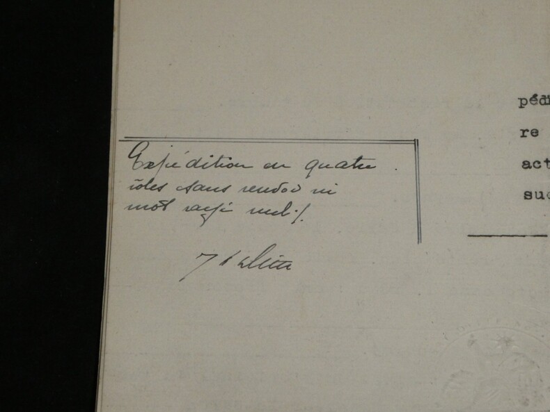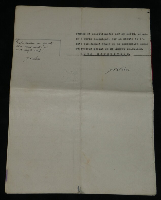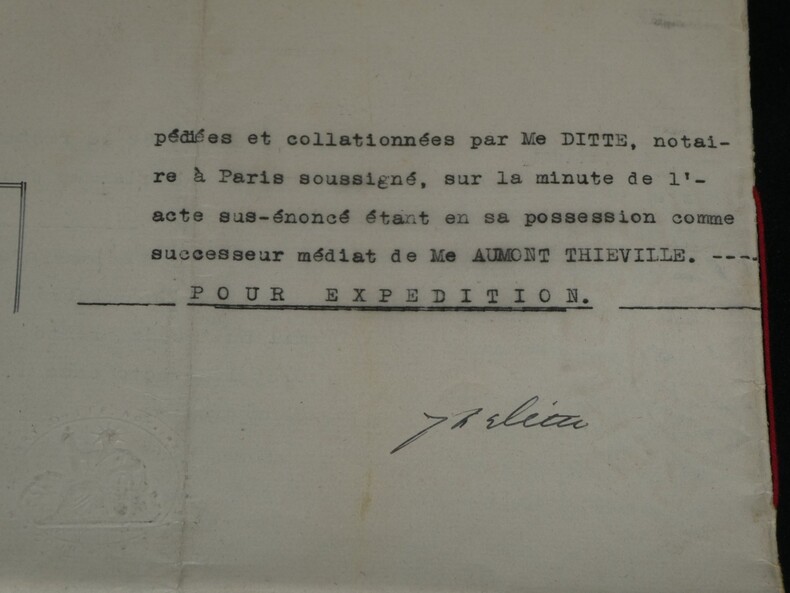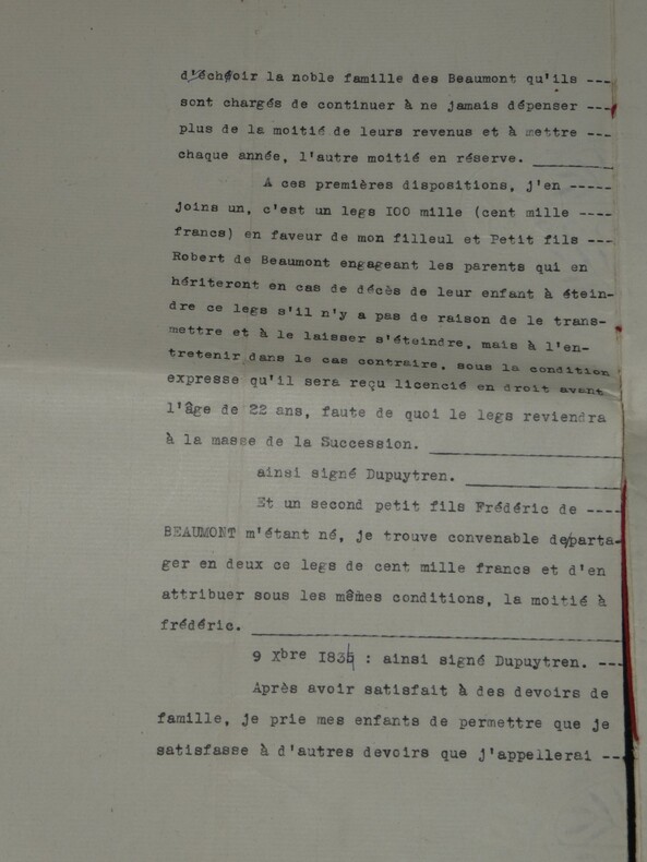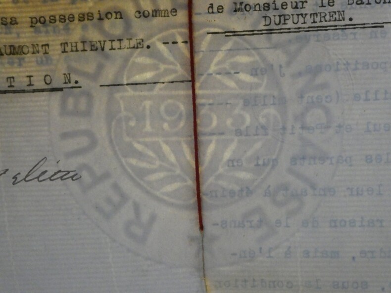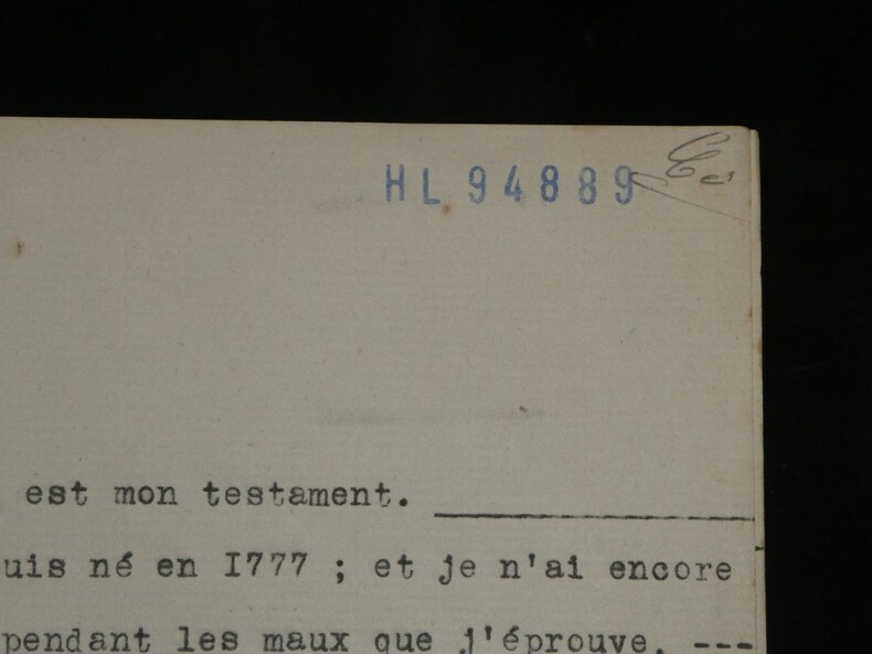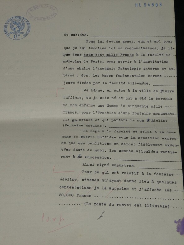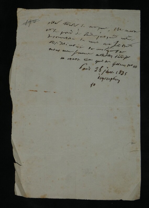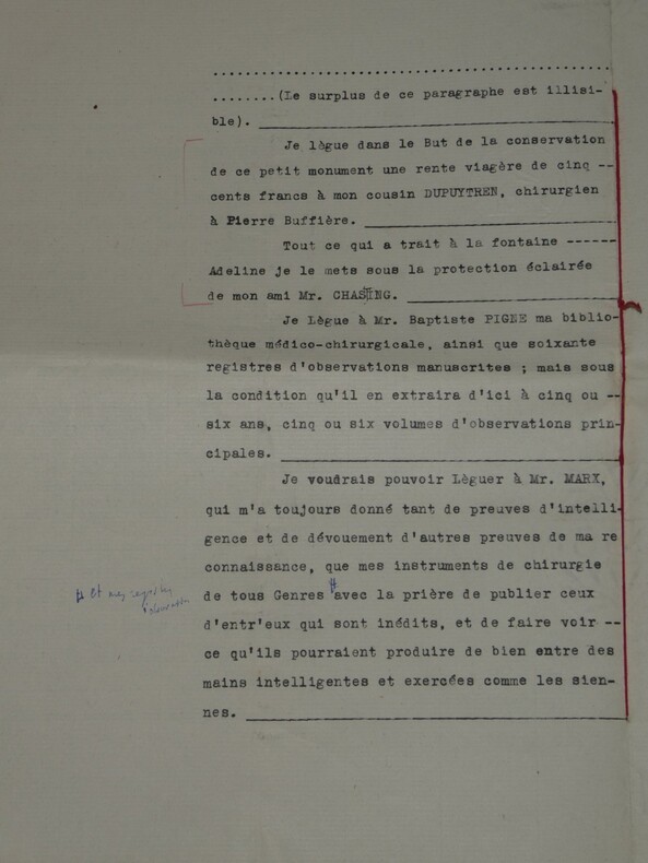 Guillaume Dupuytren. Note autographe signée 13 jours avant son décès et une réédition officielle de son testament, 1835 Anatomiste et chirurgien français Note autographe signée de Guillaume Dupuytren, datée du 26 janvier 1835, soit seulement 13 jours avant son décès. Rédigée à l'encre brune sur un feuillet de papier vergé filigrané d'une écriture désarticulée. Cette pièce présente un intérêt biographique exceptionnel pour l’histoire de la médecine. Datée du 26 janvier 1835, elle est rédigée 11 jours avant le décès de Guillaume Dupuytren, survenu le 8 février 1835. L’écriture, devenue heurtée et difficile, parfois même illisible, témoigne de l’extrême affaiblissement du chirurgien dans les dernières semaines de sa vie, après les graves accidents vasculaires qui avaient déjà brisé sa carrière depuis 1833. Le texte est de nature administrative. Dupuytren y réaffirme sa confiance envers son secrétaire et proche collaborateur, le docteur Edmond Marx (1797–1865), qui y est mentionné à deux reprises. Ce document éclaire le rôle central de Marx dans la gestion des affaires du chirurgien à la fin de sa vie, alors que celui-ci, physiquement diminué, demeure contraint de déléguer ses rapports avec l’administration. Est jointe une réédition officielle du testament de Guillaume Dupuytren, datée de 1933 (voir filigrane), document dans lequel le docteur Edmond Marx figure parmi les bénéficiaires. Dimensions : 14,3 x 20,9 cm État : Bel état de conservation. Voir photos pour plus de détails. Nombre de pages : 1 page Vous trouverez dans cette même vente plusieurs documents envoyés ou reçus par le Docteur Dupuytren, qu'il s'agisse de lettres autographes signées ou de rapports d'expertise cosignés.