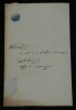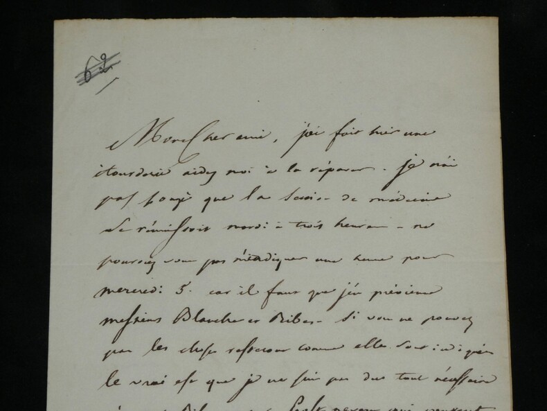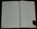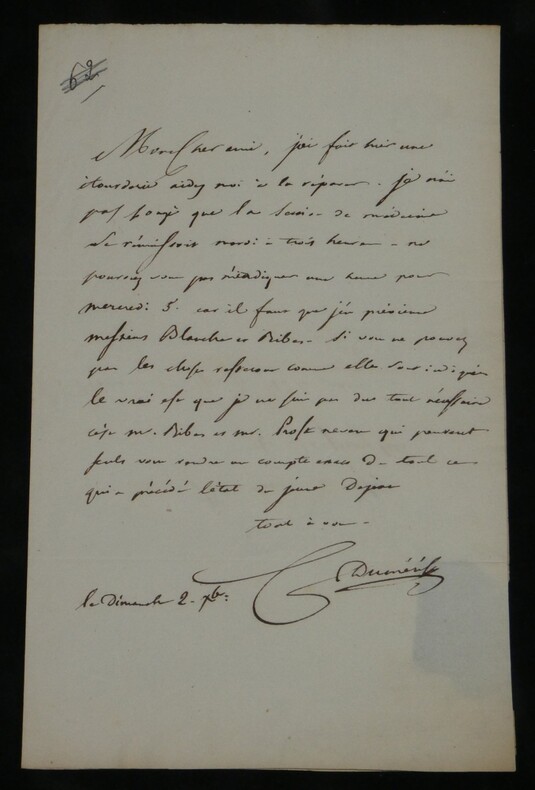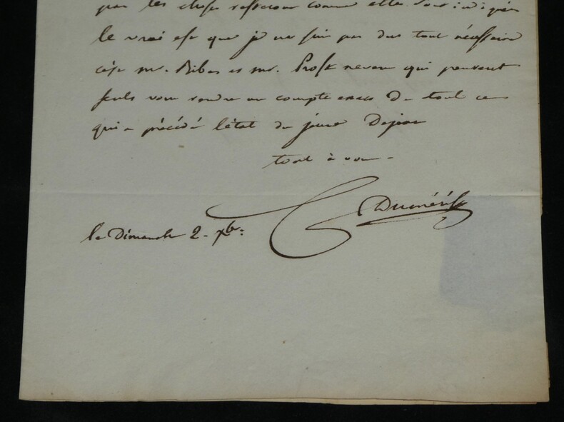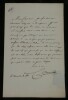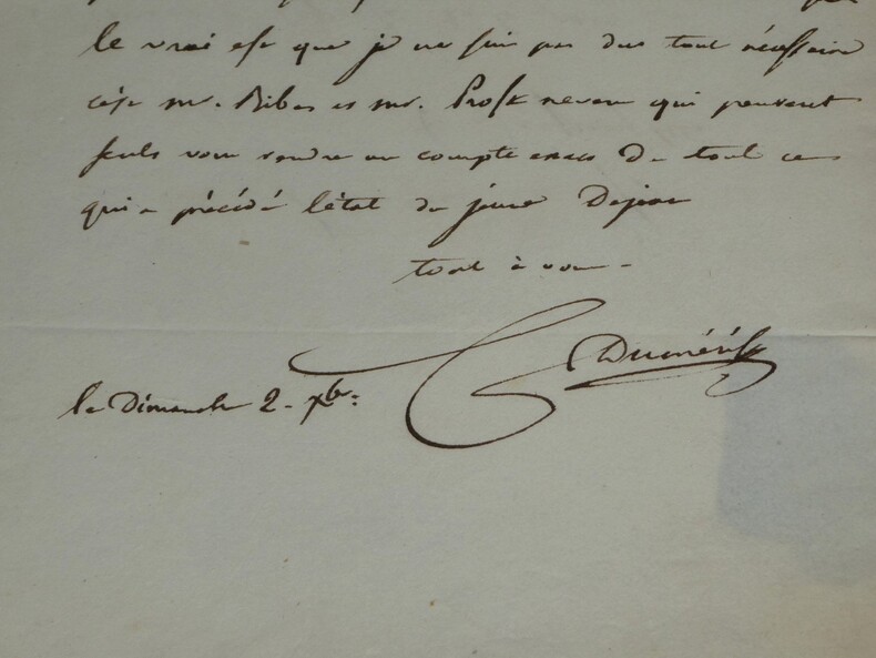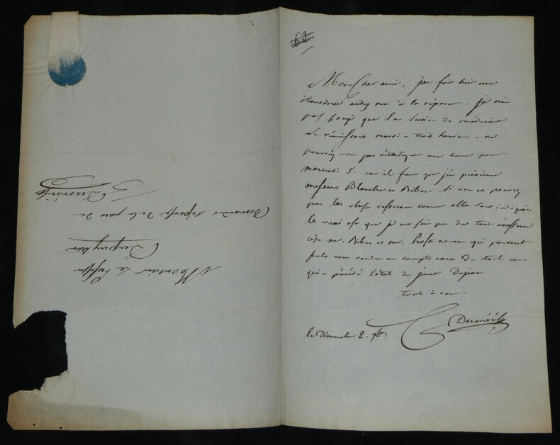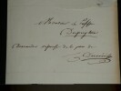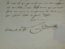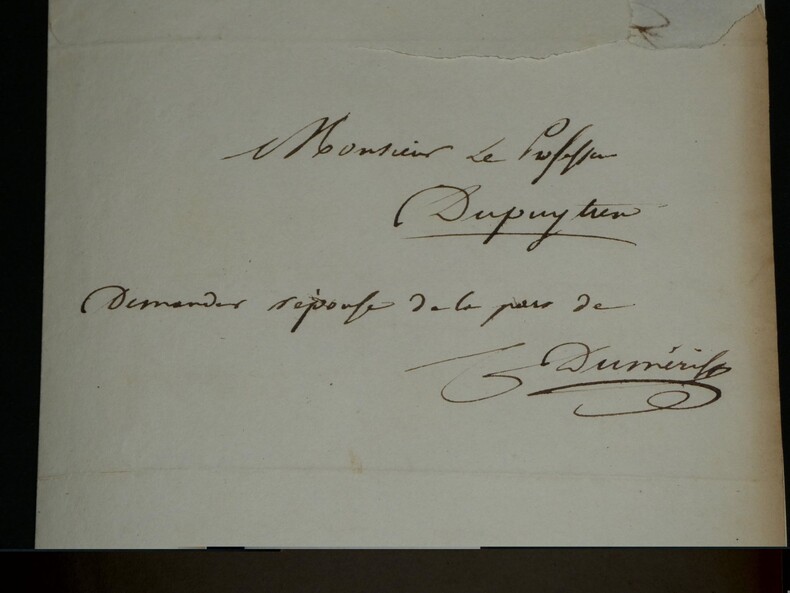 André Marie Constant Duméril. Lettre autographe signée au Baron Guillaume Dupuytren, Expertise médicale, 1825 Zoologiste, naturaliste et médecin français Lettre autographe signée d'André Marie Constant Duméril, adressée au Baron Guillaume Dupuytren, datée du dimanche 2 décembre, sans mention de l'année. Rédigée à l'encre brune sur un double feuillet de papier vélin. « Mon cher ami, j'ai fait hier une étourderie aidez-moi à la réparer. Je n'ai pas songé que la Session de médecine se réunissait mardi à trois heures - ne pourriez-vous pas m'indiquer une heure pour mercredi 5 car il faut que j'en prévienne messieurs Blanche et Ribes. Si vous ne pouvez pas les choses resteront comme elles sont indiquées [...]. Tout à vous Le Dimanche 2. Xbre » Cette lettre illustre les relations personnelles et professionnelles étroites entre André Marie Constant Duméril, naturaliste et médecin de premier plan, et Guillaume Dupuytren, figure centrale de la chirurgie française. Elle offre un témoignage direct sur l’organisation concrète des séances et réunions médicales au début du XIXᵉ siècle, à travers une correspondance de travail restée privée. Dimensions : 12,8 x 20,4 cm État : Bel état de conservation. Voir photos pour plus de détails. Nombre de pages : 1 page Vous trouverez dans cette même vente plusieurs documents envoyés ou reçus par le Docteur Dupuytren, qu'il s'agisse de lettres autographes signées ou de rapports d'expertise cosignés.