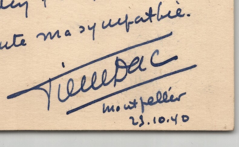 Pierre Dac. Carte lettre autographe signée, Humour Loufoque face à l'Occupation UNE PIÈCE D'HISTOIRE ET D'HUMOUR NOIR (ZONE LIBRE, OCTOBRE 1940) Humoriste et comédien français Carte lettre autographe signée de Pierre Dac, datée du 23 octobre 1940 à Montpellier. Rédigée à l'encre bleue. Pierre Dac fait preuve d'un humour grinçant et loufoque en pleine période d'Occupation. Il y livre une définition absurde et satirique de la situation géopolitique de la France de l'époque : « La ligne de démarcation est à la France ce que la chaine d arpenteur est au réveil matin (d après aristote) avec toute ma sympathie. Montpellier 21.10.40 » En octobre 1940, Pierre Dac s'est réfugié en zone libre, à Montpellier, après avoir fui Paris. C est une période charnière avant son départ pour Londres où il deviendra l'une des voix emblématiques de la France Libre sur Radio Londres ("Les Français parlent aux Français"). Cette note témoigne de l'esprit de résistance de l'auteur par l'absurde, utilisant une fausse référence à Aristote pour souligner l'incongruité et la douleur de la division du territoire français. Dimensions : 12 x 16,4 cm État : Voir photos et description pour plus de détails. Nombre de pages : 1 page Pierre Dac André Isaac, devenu officiellement Pierre Dac et André Pierre-Dac à partir du 17 février 1950, né le 15 août 1893 à Châlons-sur-Marne et mort le 9 février 1975 dans le 17 arrondissement de Paris, est un humoriste et comédien français. Wikipédia
