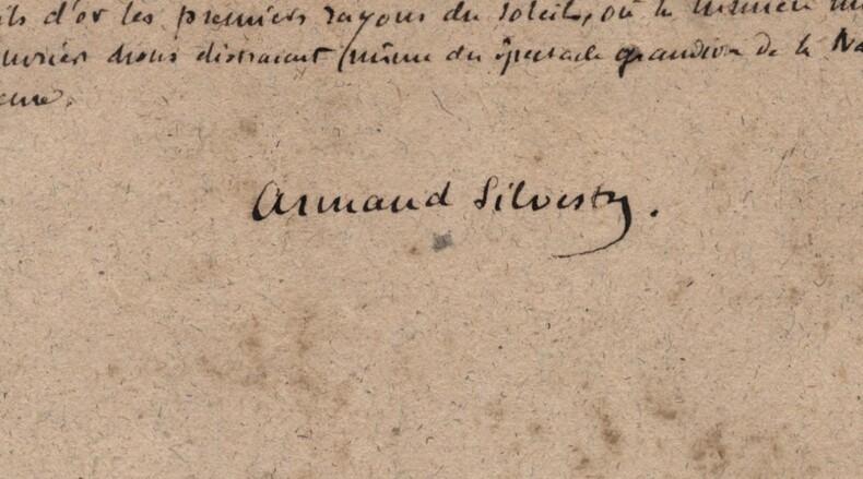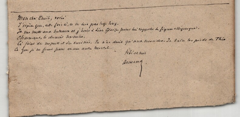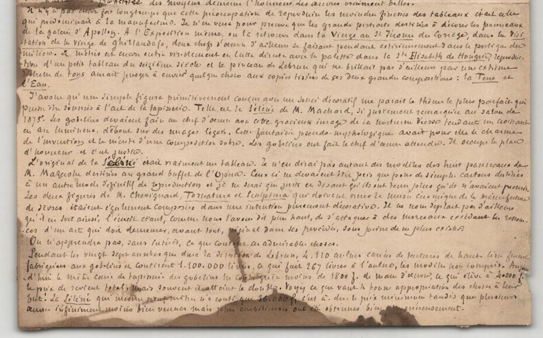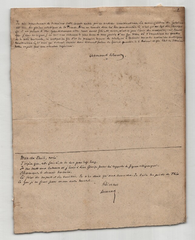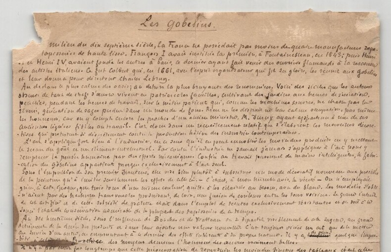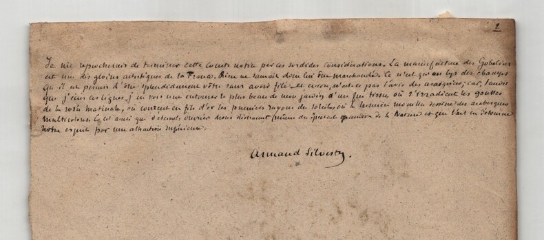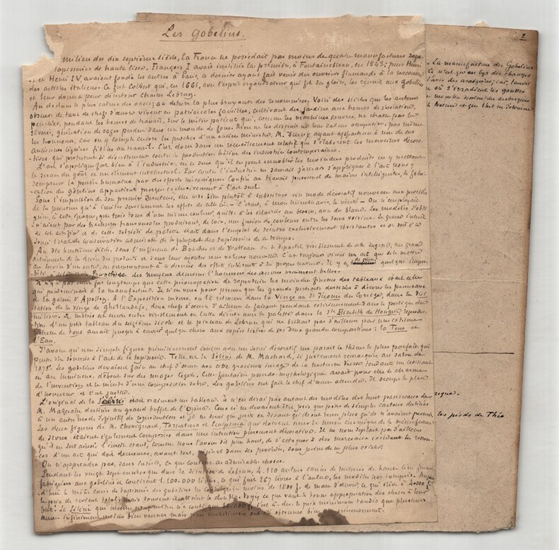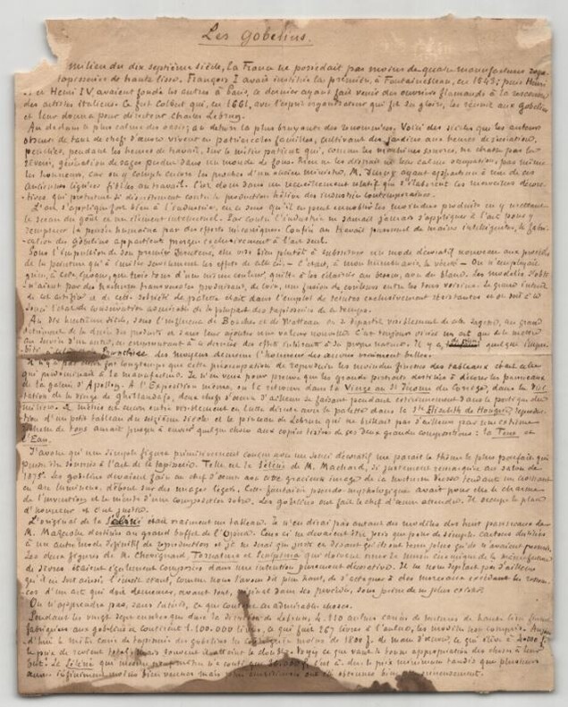 Armand Silvestre. Intéressant manuscrit autographe signé, Les Gobelins, 2pp. Écrivain, romancier, poète, conteur, librettiste et critique d'art français Intéressant manuscrit autographe signé d'Armand Silvestre, intitulé "Les Gobelins", non datée, rédigée à l'encre brune sur un feuillet de papier vergé filigrané et un feuillet de papier vélin. Ce manuscrit constitue une réflexion historique et descriptive dans laquelle Silvestre retrace l origine et l évolution des manufactures royales, en mettant particulièrement l accent sur la Manufacture des Gobelins. Il évoque le rôle décisif de Colbert, la direction de Charles Le Brun et le fonctionnement interne de ces ateliers au sein de l administration royale. Le texte, nourri d images précises et de références institutionnelles, souligne la continuité des savoir-faire et la place centrale occupée par les Gobelins dans le patrimoine artistique et décoratif français. On y lit notamment : « Ce fut Colbert qui, en 1661, avec l esprit organisateur qui fit sa gloire, les réunit aux Gobelins et leur donna pour directeur Charles Lebrun. [...] Au dedans le plus calme des oasis ; au dehors la plus bruyante des renommées. Voici des siècles que les auteurs obscur de tant de chefs d' uvres vivent en patriarcales familles, cultivant des jardins aux heures de récréation. Penchés, pendant les heures de travail, sur le métier patient qui, comme les machines sonores, ne chasse pas la rêverie, génération de sages perdue dans un monde de fous. Rien ne les distrait ni leur calme occupation, pas même les honneurs » Le manuscrit se termine par un mot autographe signé d'Armand Silvestre, à un certain Émile , dans lequel il commente la longueur de son texte, mentionne l artiste Léon Glaize et fait référence au dernier numéro de la revue à laquelle il collabore : « Mon cher Émile, voici J'espère que, cette fois ci, ce ne sera pas trop long. Je me mets aux bateaux et j'écris à Léon Glaize pour lui rappeler ses figures allégoriques. Charmant, le dernier numéro. Ci-joint du respect et des amitiés. Tu n'as droit qu'aux secondes. Je baise les pieds de Théo Ce que je ne ferais pour aucun autre mortel. » État : Voir photos et description pour plus de détails. Nombre de pages : 2 pages Dimension : 15,6 x 19,6 cm