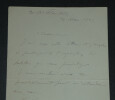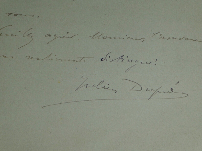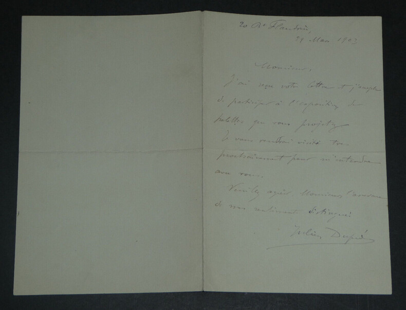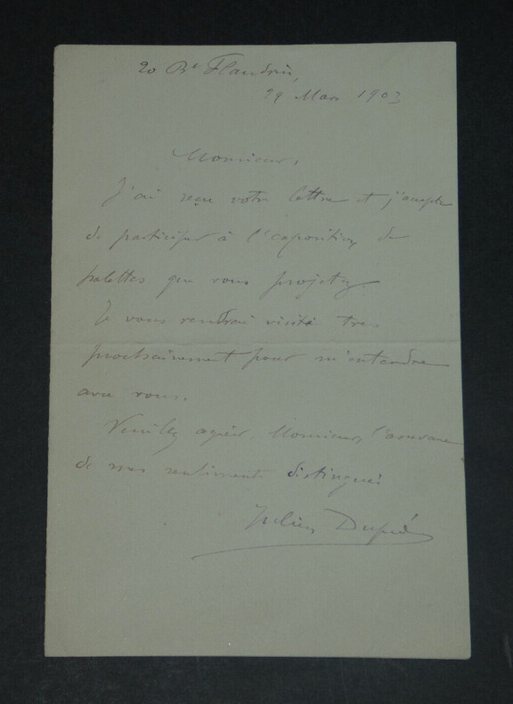 **Julien DUPRÉ. Lettre autographe signée, 1903 Peintre français** Lettre autographe signée de Julien Dupré, datée du 29 mars 1903, sur un double feuillet. "Monsieur, J'ai reçu votre lettre et j'accepte de participer à l'exposition de palettes que vous projetez. Je vous rendrai visite très prochainement pour m'entendre avec vous. Veuillez agréer, Monsieur, l'assurance de mes sentiments distingués." Dimensions : 11,4 x 17,4 cm État : Voir photos pour plus de détails. Nombre de pages : 1 page **Julien DUPRÉ** Julien Dupré est un peintre français né le 18 mars 1851 à Paris et mort dans la même ville le 15 avril 1910. Wikipédia