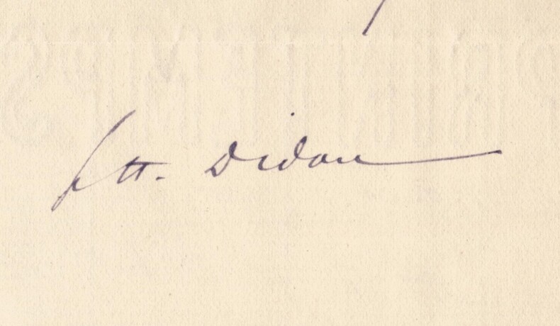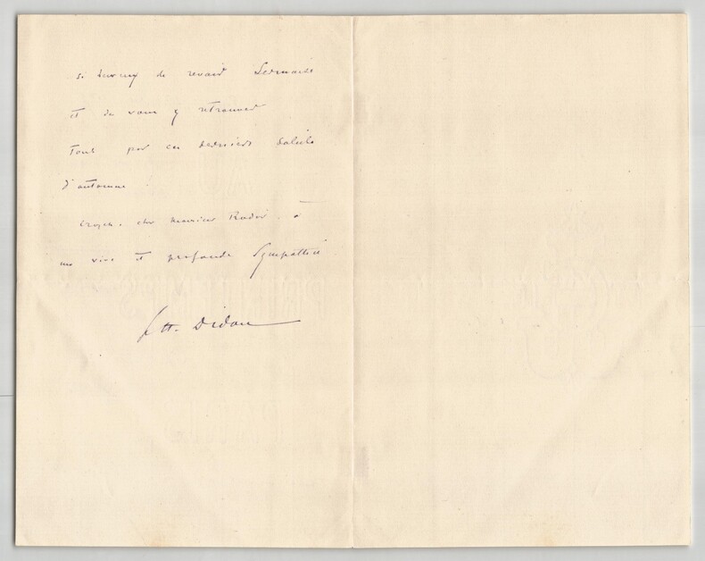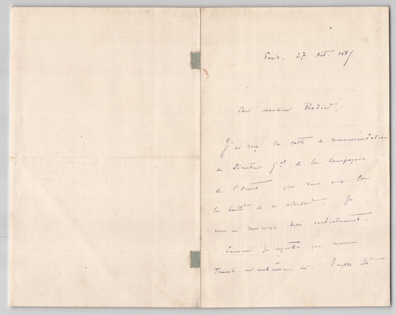 Henri Didon. Lettre autographe signée à Monsieur Rodier, 1881 Écrivain et homme d'Église Lettre autographe signée d'Henri Didon, adressée à Monsieur Rodier, datée du 27 Octobre 1881 à Paris. Rédigée à l'encre bleue sur un double feuillet de papier vergé filigrané. « Cher Monsieur Rodier, J'ai reçu la carte de recommandation du Directeur Gal de la Compagnie de l'Ouest que vous avez eu la bonté de m'adresser. Je vous en remercie bien cordialement. Comme je regrette que mon travail m'entraine ici. J'eusse été si heureux de revoir Sermaise et de vous y retrouver tous par ces derniers soleils d'automne. Croyez, cher Monsieur Rodier, à ma vive et profonde sympathie. » Dimensions : 11,3 x 17,8 cm État : Traces d'onglets au dos. Voir photos et description pour plus de détails. Nombre de pages : 2 pages