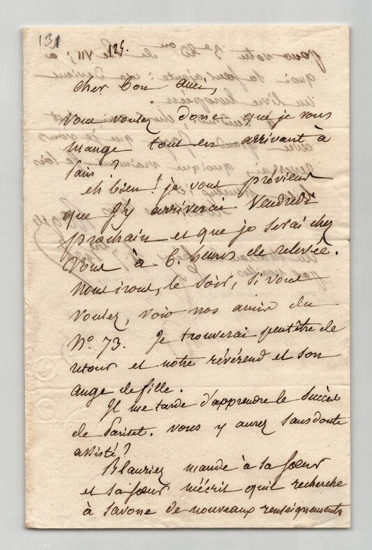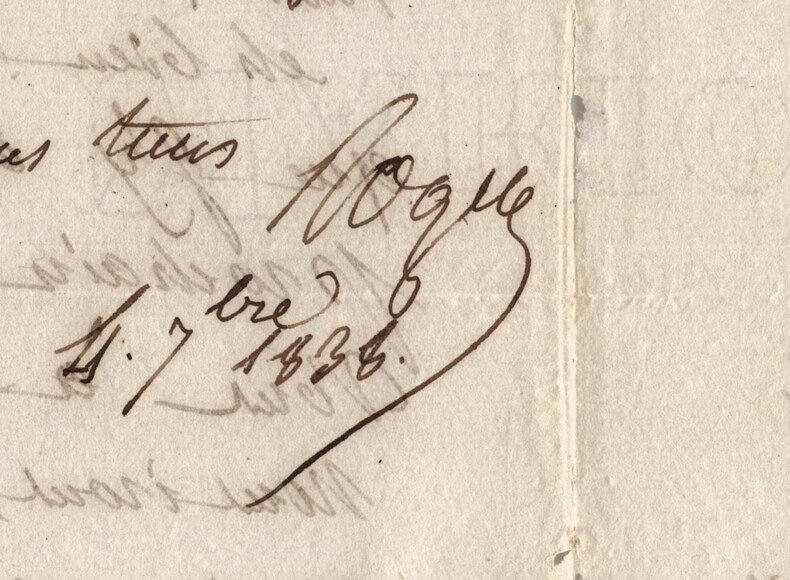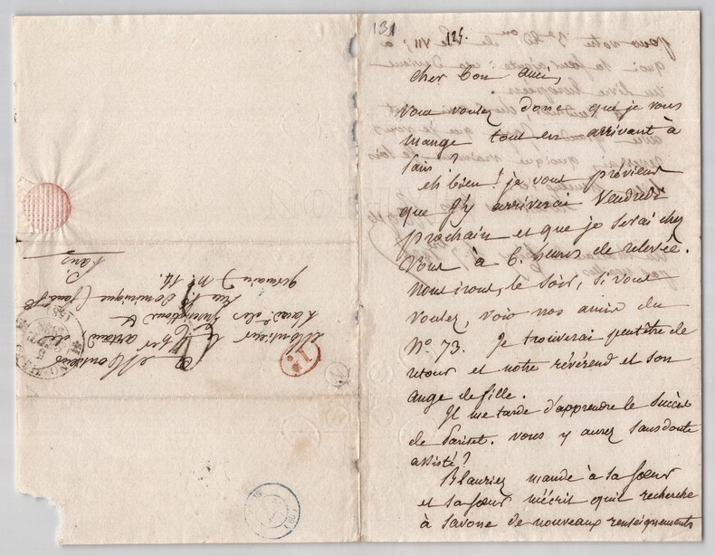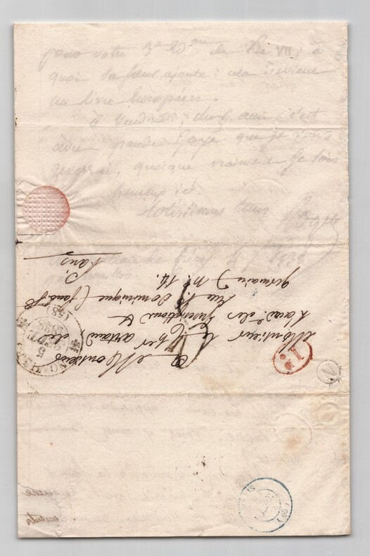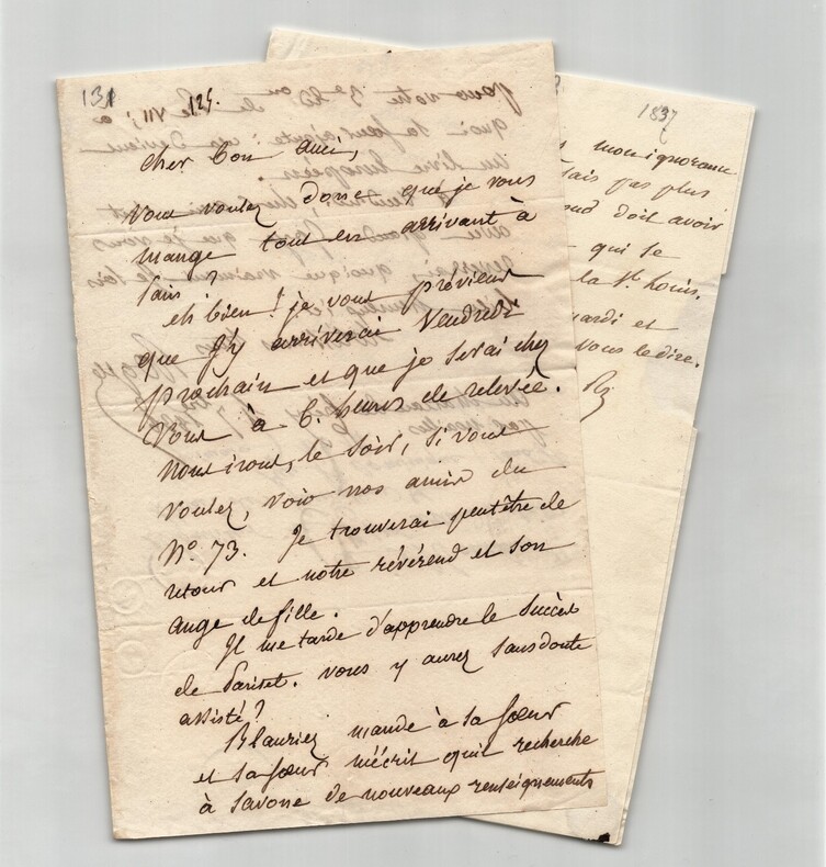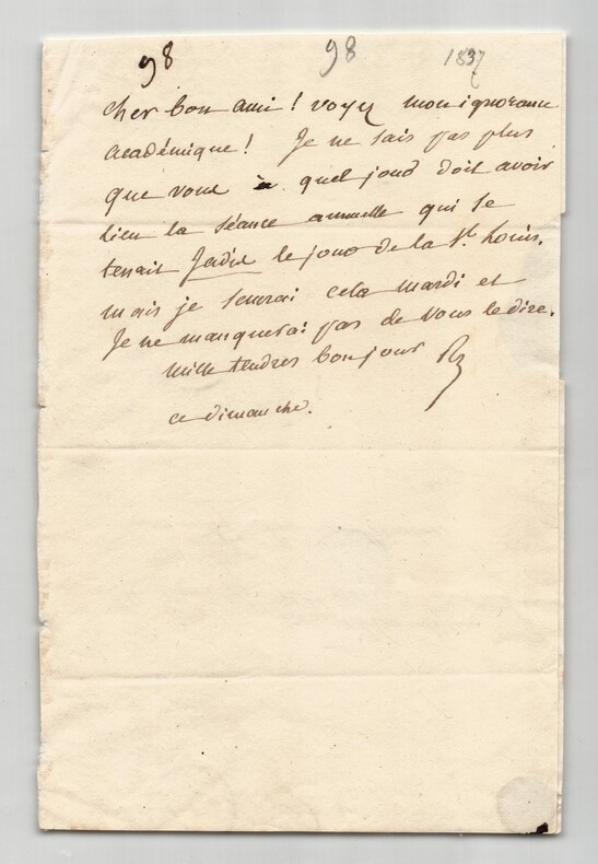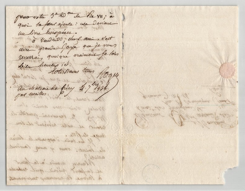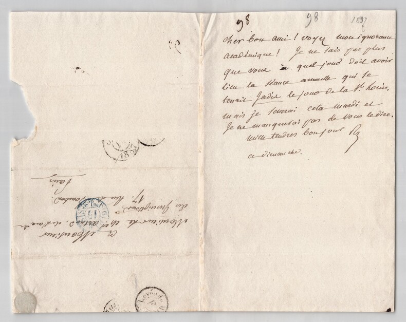 Jean-Baptiste ROQUES. Deux lettres autographes signées à Artaud de Montor, 1837 et 1938 Lot de deux lettres autographes signées de Jean-Baptiste Roques, adressée à Alexis-François Artaud de Montor. 1/ Lettre autographe signée, non datée. Rédigée à l'encre brune sur un double feuillet de papier vélin, tamponnée de 1837. « Cher bon ami ! Voyez mon ignorance académique ! Je ne sais pas plus que vous quel jour doit avoir lieu la séance annuelle qui se tenait jadis le jour de la St Louis. Mais je saurai cela mardi et je ne manquerai pas de vous le dire. Mille tendres bonjour Ce dimanche » Dimensions : 12,9 x 19,5 cm État : Voir photos et description pour plus de détails. Nombre de pages : 1 page 2/ Lettre autographe signée, datée du 4 septembre 1838 au Château de Crécy. Rédigée à l'encre brune sur un double feuillet de papier vélin filigrané. « Cher bon ami, Vous voulez donc que je vous mange tout en arrivant à Paris ? Eh bien ! Je vous prévient que j'y arriverai vendredi prochain et que je serai chez vous à 6 heures de relevée. Nous irons le soir, si vous voulez, voir nos amis du n°73. [...] » Dimensions : 13 x 20 cm État : Voir photos et description pour plus de détails. Nombre de pages : 2 pages