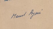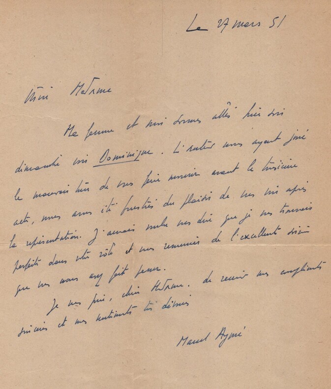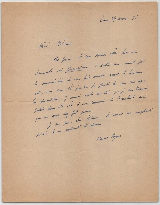 Marcel Aymé. Lettre autographe signée à une actrice de Dominique - 1951 Écrivain, dramaturge, nouvelliste, scénariste et essayiste français Lettre autographe signée de Marcel Aymé, adressée à une femme, datée du 27 mars 1951. Rédigée à l'encre bleue sur un feuillet de papier vélin. Dans cette lettre, l écrivain revient sur une représentation théâtrale à laquelle il a assisté avec son épouse. Il exprime son regret de ne pas avoir pu saluer l actrice après la pièce, et il lui adresse ses félicitations pour son interprétation : "Chère Madame, Ma femme et moi sommes allés hier soir dimanche voir Dominique. L'auteur vous ayant joué le mauvais tour de vous faire revenir avant le troisième acte, nous avons été frustrés du plaisir de vous voir après la représentation. J'aurais voulu vous dire que je vous trouvais parfaite dans votre rôle et vous remercier de l'excellente soirée que vous nous avez fait passer. Je vous prie, chère Madame, de recevoir mes compliments sincères et mes sentiments très dévoués." Un document vivant qui illustre les liens étroits entre Marcel Aymé et le monde du théâtre, et qui témoigne de son attention aux comédiens et à la qualité des mises en scène de ses uvres ou de ses contemporains. Dimensions : 20,9 x 26,8 cm État : Voir photos pour plus de détails. Nombre de pages : 1 page