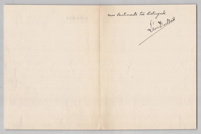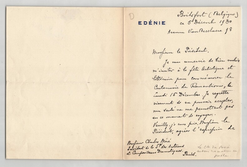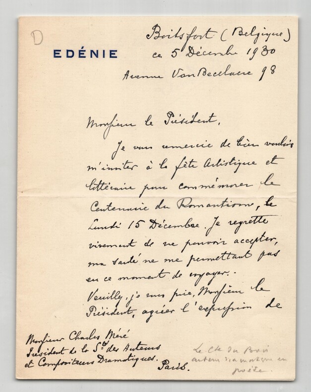 Léon Du Bois. Lettre autographe signée à Charles Méré, 1930 Auteur dramatique, scénariste et directeur de production français Lettre autographe signée de Léon Du Bois, compositeur et organiste belge, adressée à Charles Méré, président de la Sté des Auteurs et Compositeurs Dramatiques, datée du 5 décembre 1930. Rédigée à l'encre noire, sur un double feuillet de papier vergé à entête "Edénie". Il remercie son correspondant pour l'invitation à la fête Artistique et littéraire pour commémorer le Centenaire de Romantisme, le lundi 15 décembre, mais regrette de ne pouvoir accepter car il ne peut voyager à cause de son état de santé. Dimensions : 13,8 x 18 cm État : Voir photos et description pour plus de détails. Nombre de pages : 2 pages