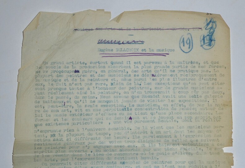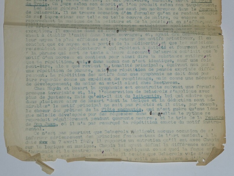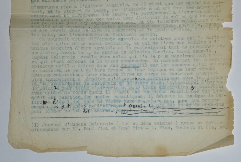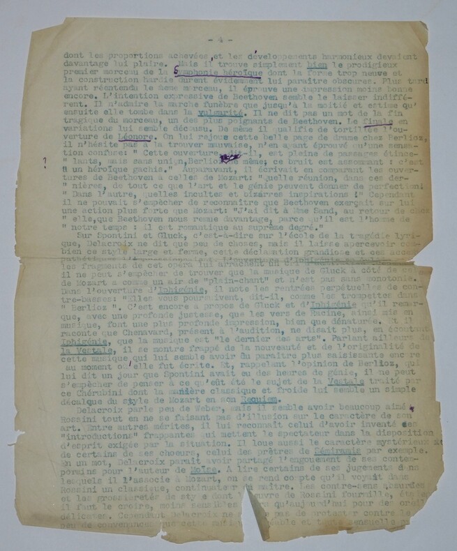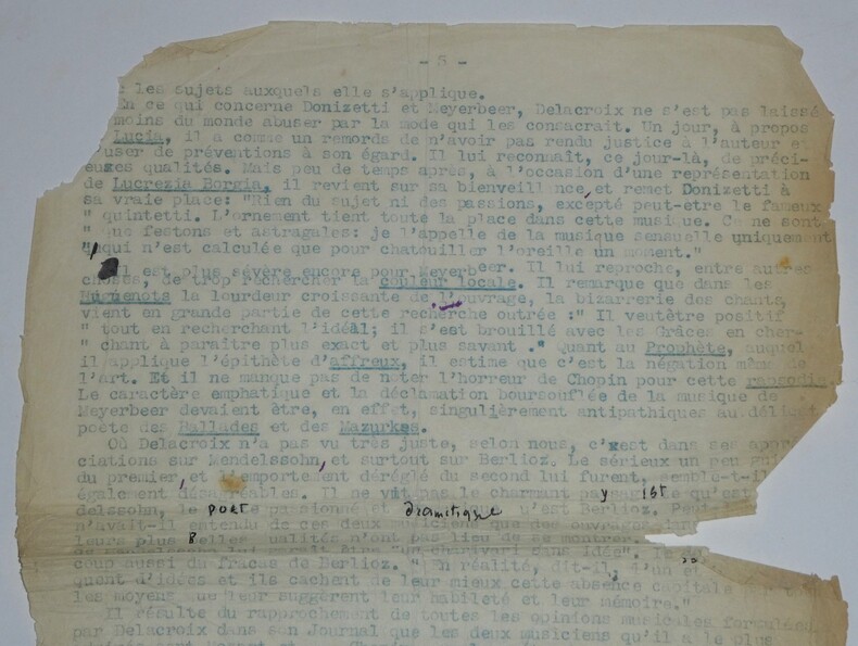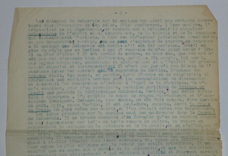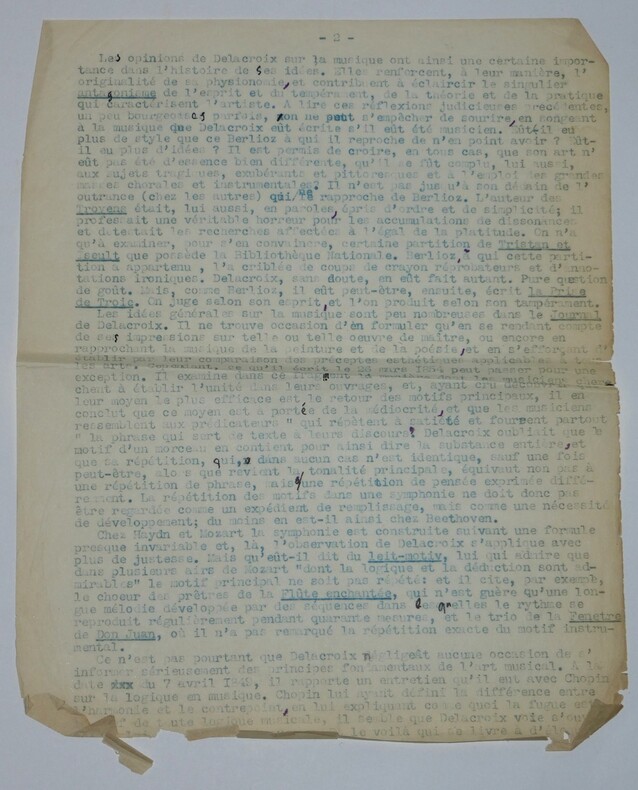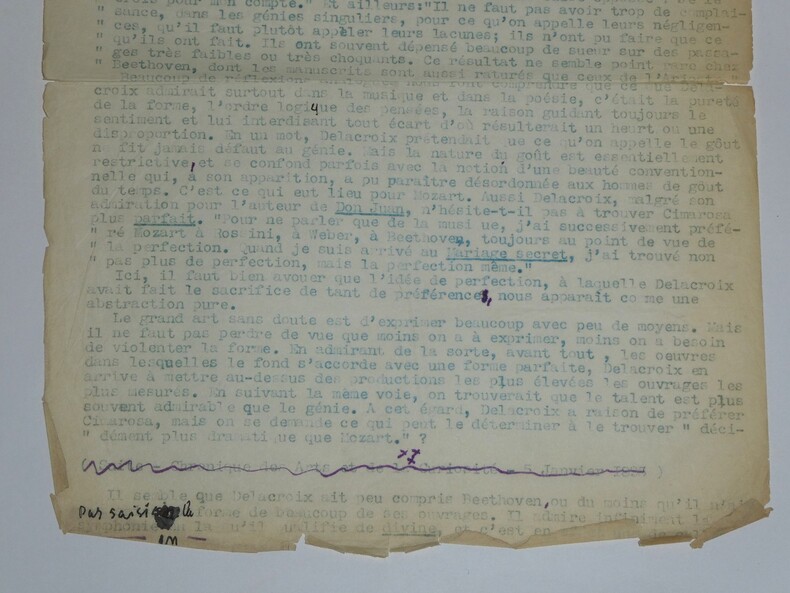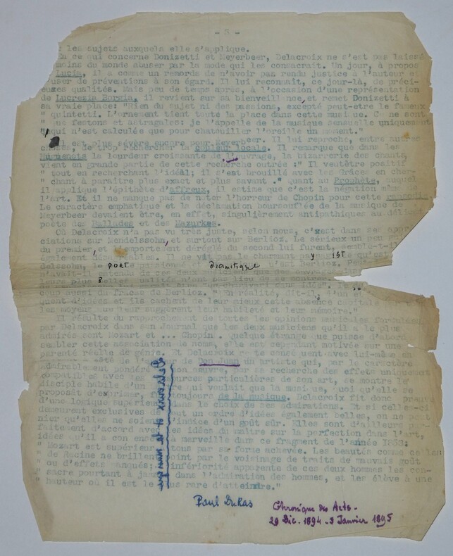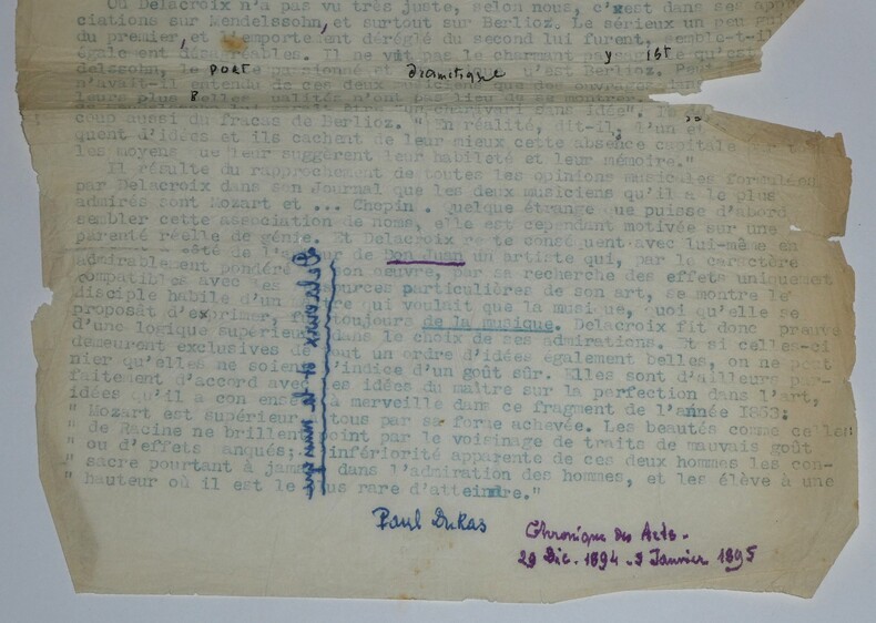 Paul Dukas. Tapuscrit "Eugène Delacroix et la musique" annoté, et biffé Compositeur français Tapuscrit de Paul Dukas, intitulé "Eugène Delacroix et la musique". Le texte est annoté, et biffé à l'encre noire et violette (par un tiers ?). Rédigée sur 5 feuillets de papier très fin. Une note manuscrite à la fin du tapuscrit indique : "Chronique des Arts - 29 Déc. 1894 - 5 janvier 1895" Cet ensemble constitue la base de l'article paru dans la Chronique des Arts et de la Curiosité (supplément de la Gazette des Beaux-Arts) lors des livraisons du 29 décembre 1894 et du 5 janvier 1895. (voir : gallica.bnf.fr/ark:/12148/bpt6k6344293m/f17) C'est une analyse approfondie des goûts musicaux d'Eugène Delacroix à travers son Journal. Sont notamment évoqués ses rapports avec Chopin, son admiration pour Mozart, ainsi que des critiques sur Beethoven, Berlioz, Wagner ou encore Meyerbeer. Avec une annotation manuscrite "Paul Dukas" apposée en fin de texte sur le cinquième feuillet. Dimensions : 21 x 26,5 cm État : Papier pelure très fin et fragile, avec de multiple déchirures et manques avec atteinte du texte. Voir photos et description pour plus de détails. Nombre de pages : 5 pages