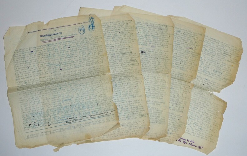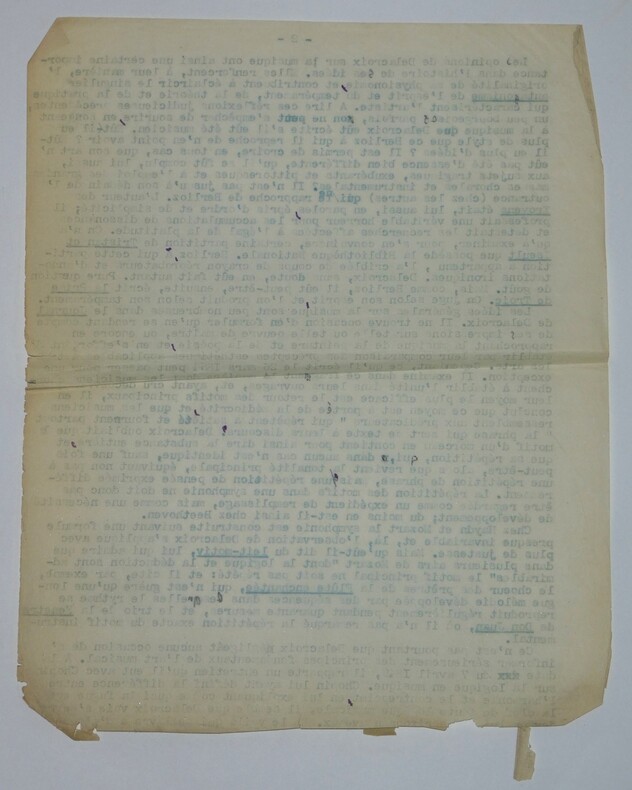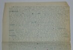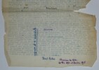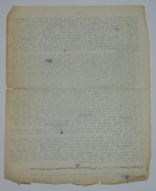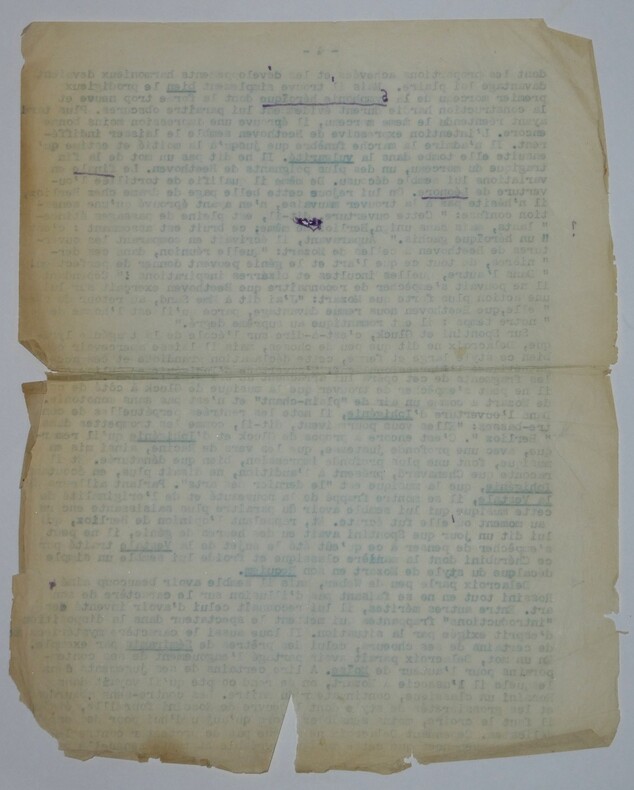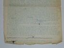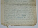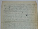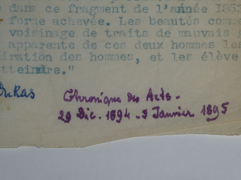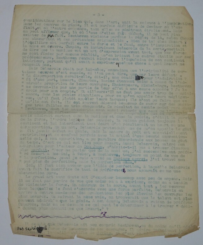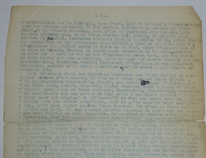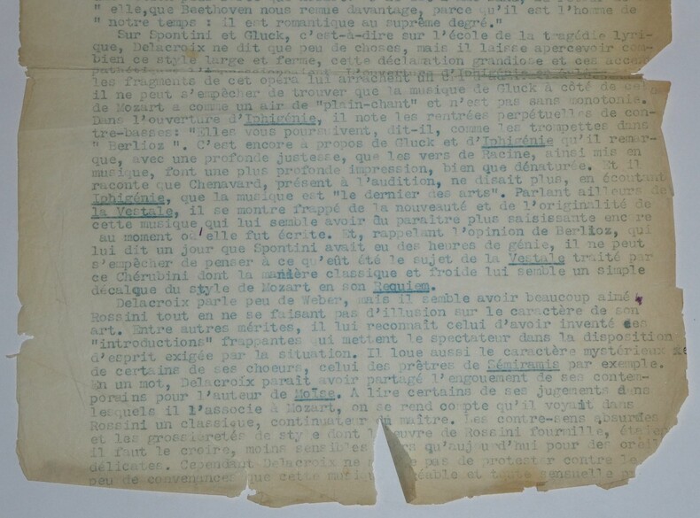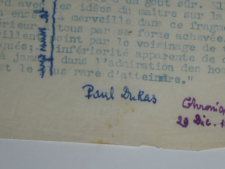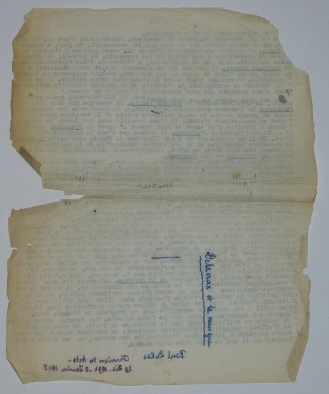 Paul Dukas. Tapuscrit "Eugène Delacroix et la musique" annoté, et biffé Compositeur français Tapuscrit de Paul Dukas, intitulé "Eugène Delacroix et la musique". Le texte est annoté, et biffé à l'encre noire et violette (par un tiers ?). Rédigée sur 5 feuillets de papier très fin. Une note manuscrite à la fin du tapuscrit indique : "Chronique des Arts - 29 Déc. 1894 - 5 janvier 1895" Cet ensemble constitue la base de l'article paru dans la Chronique des Arts et de la Curiosité (supplément de la Gazette des Beaux-Arts) lors des livraisons du 29 décembre 1894 et du 5 janvier 1895. (voir : gallica.bnf.fr/ark:/12148/bpt6k6344293m/f17) C'est une analyse approfondie des goûts musicaux d'Eugène Delacroix à travers son Journal. Sont notamment évoqués ses rapports avec Chopin, son admiration pour Mozart, ainsi que des critiques sur Beethoven, Berlioz, Wagner ou encore Meyerbeer. Avec une annotation manuscrite "Paul Dukas" apposée en fin de texte sur le cinquième feuillet. Dimensions : 21 x 26,5 cm État : Papier pelure très fin et fragile, avec de multiple déchirures et manques avec atteinte du texte. Voir photos et description pour plus de détails. Nombre de pages : 5 pages