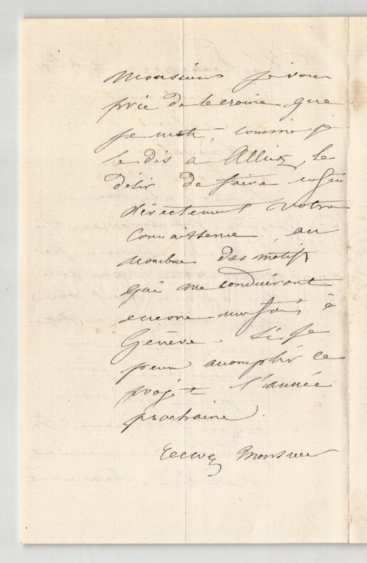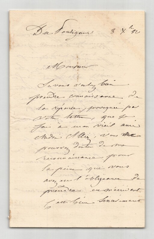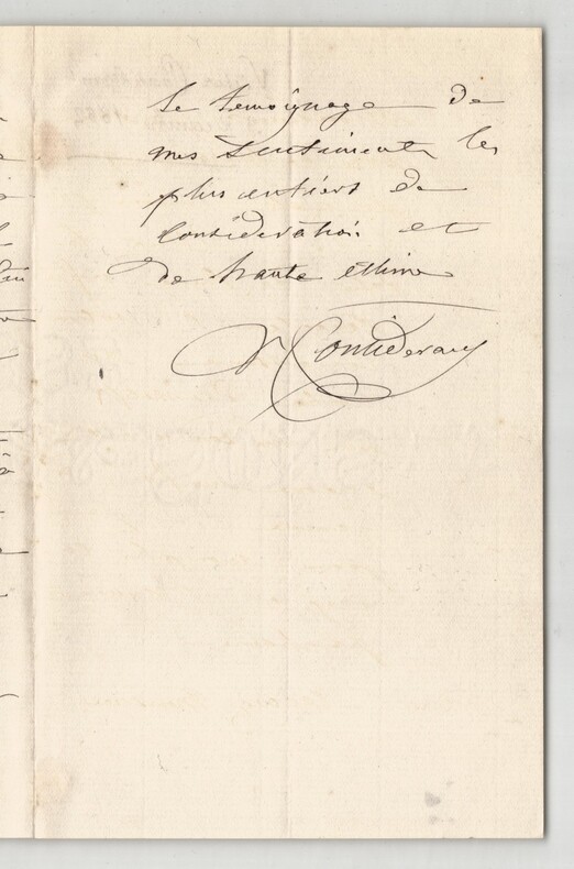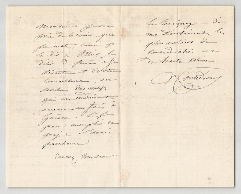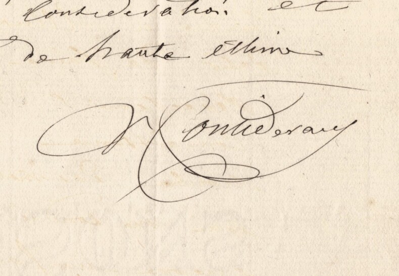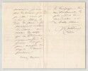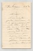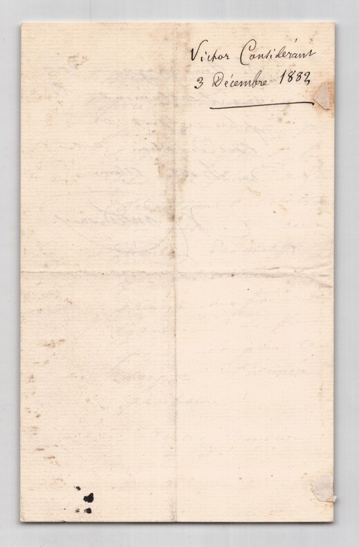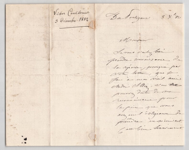 Victor Considérant. Lettre autographe signée, 1882 Député, Philosophe et économiste polytechnicien français Lettre autographe signée de Victor Considérant, datée du 3 décembre 1882 au Pouliguen, rédigée à l'encre noire sur un double feuillet de papier vergé filigrané. Dans cette lettre adressée à un correspondant, Victor Considérant fait référence à son ami de longue date, André Alliez, et exprime avec chaleur son désir de faire directement la connaissance de son interlocuteur. Il insiste sur la reconnaissance qu il éprouve pour l attention reçue et précise que cette rencontre figure désormais parmi les motifs qui le conduiront à se rendre à Genève. "Monsieur, Si vous voulez bien prendre connaissance de la réponse provoquée votre lettre, que je fais à mon vieil ami André Alliez, vous ne pouvez douter de ma reconnaissance pour la peine que vous avez eu l'obligeance de prendre en m'écrivant. C'est bien sincèrement, Monsieur, je vous prie de le croire que je mets, comme je le dis à Alliez, le désir de faire enfin directement votre connaissance, au nombre des motifs qui me conduiront encore une fois à Genève. Si je peux accomplir ce profit l'année prochaine. Recevez Monsieur le témoignage de mes sentiments les plus entiers de considération et de haute estime." Cette lettre, empreinte de politesse et de courtoisie, illustre le style épistolaire de Considérant à la fin de sa vie, alors qu il s était retiré au Pouliguen après ses longues années d engagement politique et socialiste. Dimensions : 11,3 x 18 cm État : Voir photos et description pour plus de détails. Nombre de pages : 3 pages Victor Considérant Victor Prosper Considerant, né le 12 octobre 1808 à Salins-les-Bains et mort le 27 décembre 1893 à Paris 7 , est un philosophe et économiste polytechnicien français, internationaliste et franc-maçon adepte du fouriérisme. Wikipédia