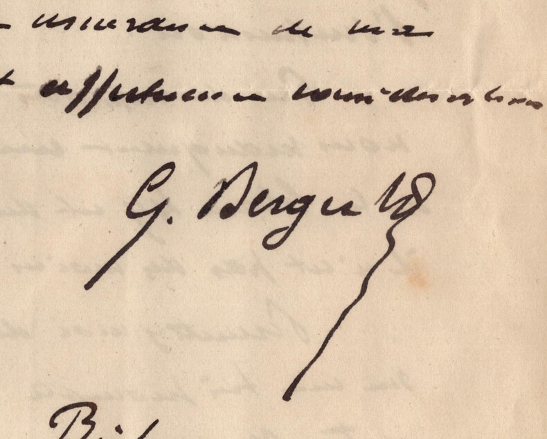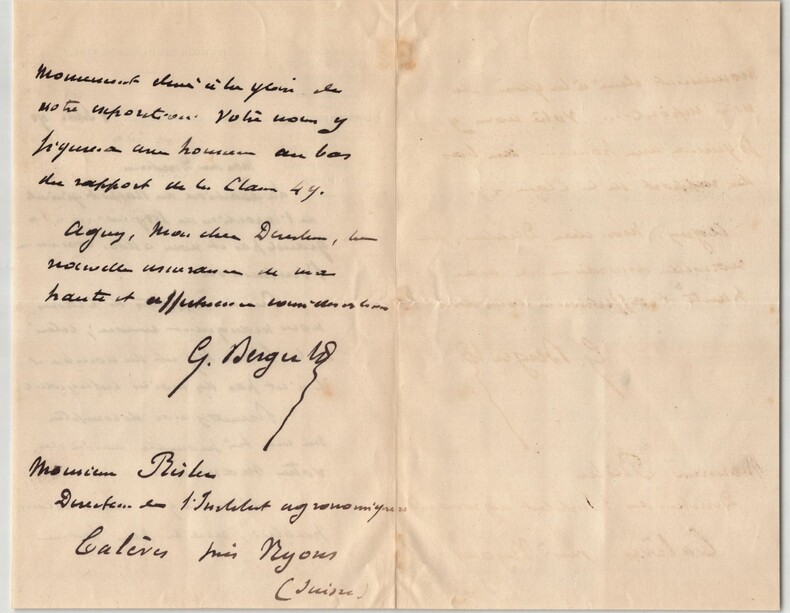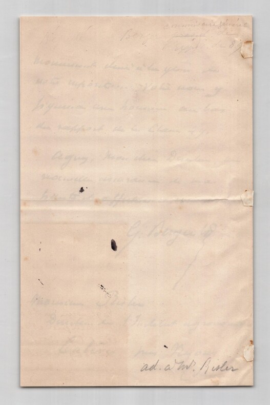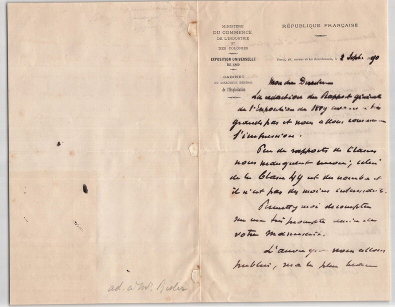 Paul Georges Louis Berger. Lettre autographe signée à Monsieur Risler, 1890 Ingénieur et homme politique français Lettre autographe signée de Paul Georges Louis Berger, adressée à Monsieur Risler, datée du 2 septembre 1890 à Paris, rédigée à l’encre noire sur un double feuillet de papier vélin à entête du Ministère du Commerce de l'Industrie et des Colonies. Dans cette lettre officielle, Berger signale l’avancement de la rédaction du rapport général de l’Exposition universelle de 1889 et sollicite un dernier envoi de documents pour compléter les rapports de certaines classes thématiques, dont la classe 49. Il insiste sur l’importance du dossier manquant pour l’impression imminente du volume, soulignant que le nom du destinataire y figurera comme contributeur. « Mon cher Directeur, La rédaction du Rapport général de l'exposition de 1889 avance à très grand pas et nous allons commencer l'impression. Peu de rapports de classes nous manquent encore ; celui de la classe 49 est du nombre et il n'est pas des moins intéressants. [...] » Lettre à la fois administrative et cordiale, où Berger exprime aussi ses sentiments respectueux à l'égard de son correspondant. Dimensions : 13,3 x 21,2 cm État : Traces d'onglet au dos de la lettre sinon très bel état de conservation. Voir photos pour plus de détails. Nombre de pages : 2 pages