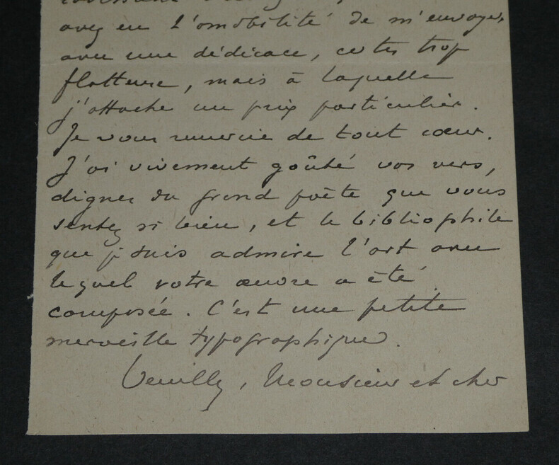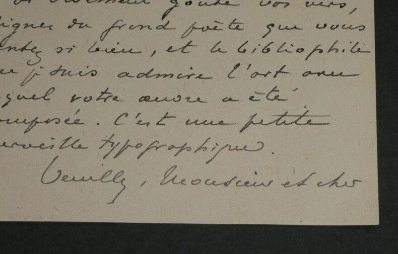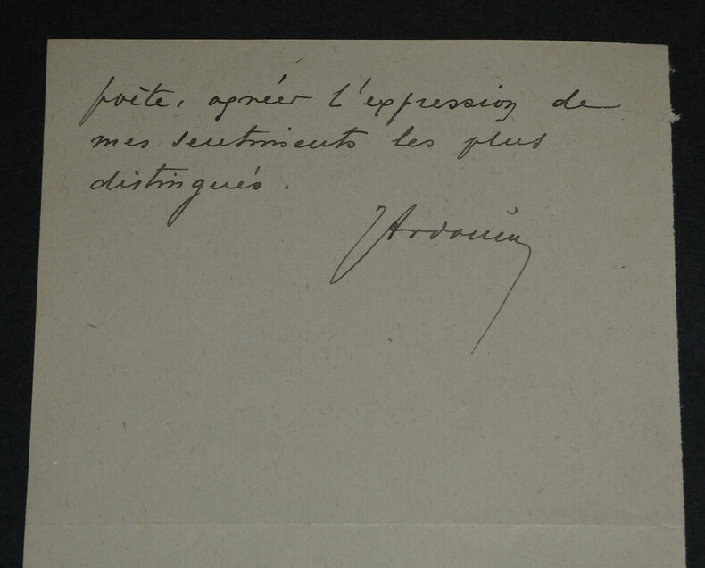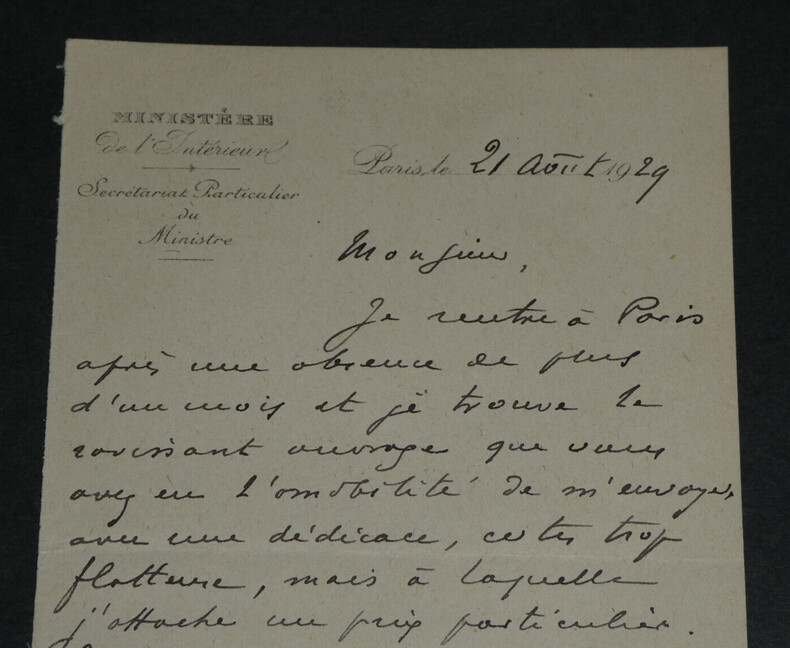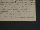 André Tardieu. Lettre autographe signée à Armand Godoy - 1929 Lettre autographe signée d' André Tardieu, adressée à Armand Godoy, datée du 21 août 1929 . "Monsieur, Je rentre à Paris après une absence de plus d'un mois et je trouve le ravissant ouvrage que vous avez eu l'amabilité de m'envoyer avec une dédicace, certes trop flatteuse, mais à laquelle j'attache un prix particulier. Je vous remercie de tout c ur. J'ai vivement goûté vos vers, dignes du grand poète que vous sentez si bien, et le bibliophile que je suis admire l'art avec lequel votre uvre a été composée. C'est une petite merveille typographique. Veuillez, Monsieur et cher poète, agréer l'expression de mes sentiments les plus distingués." Dimensions : 10,5 x 17,3 cm État : Voir photos pour plus de détails. Nombre de pages : 2 pages