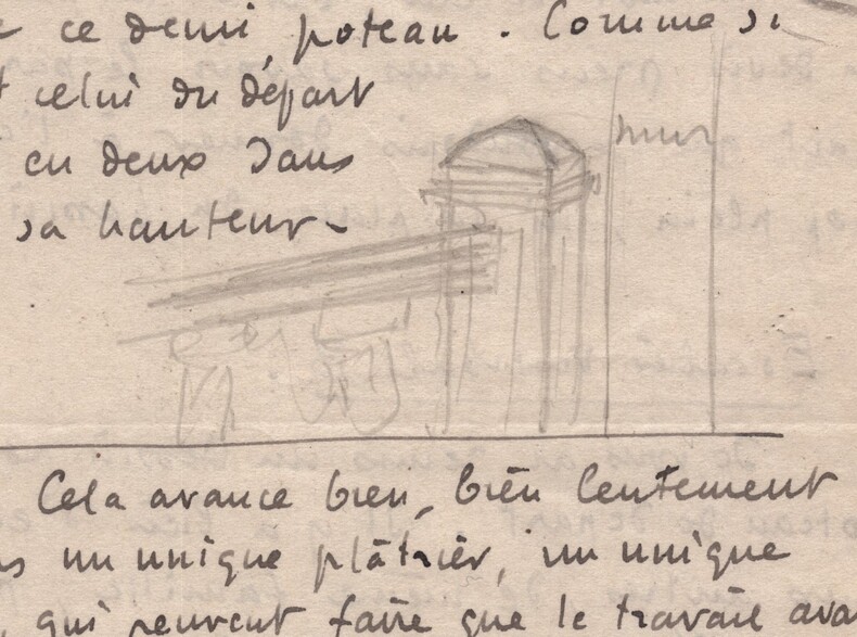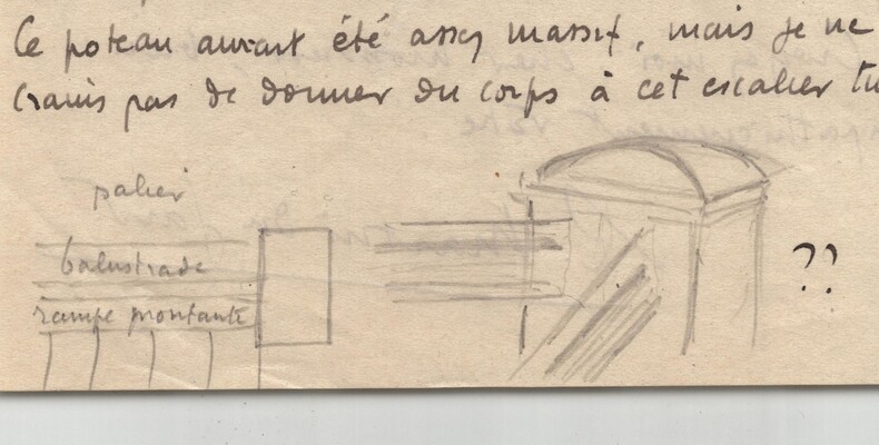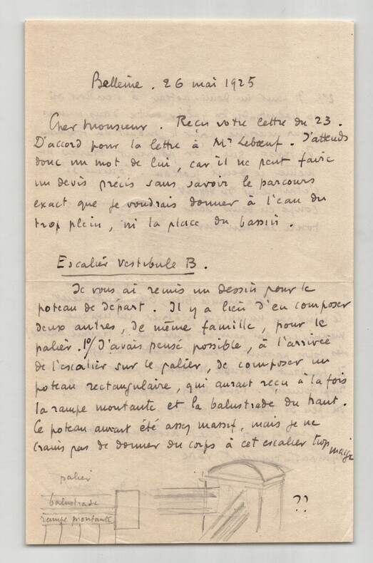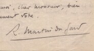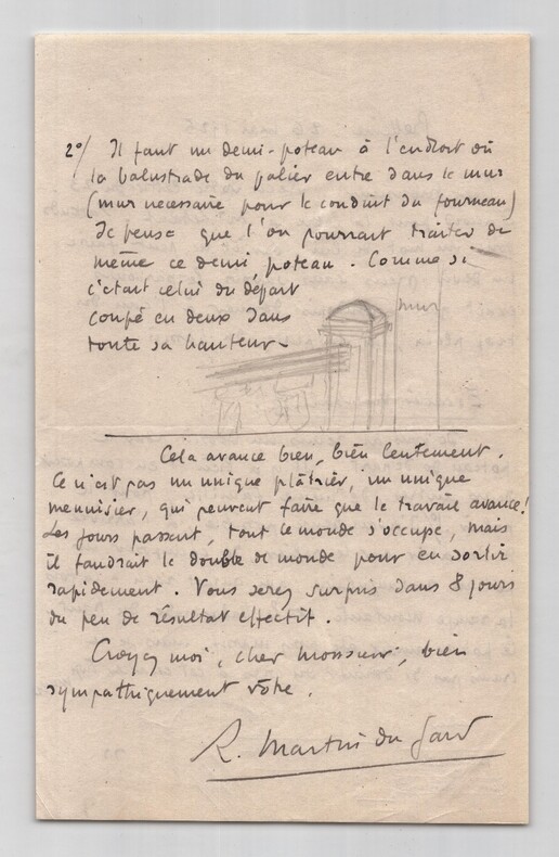 Roger Martin du Gard. Lettre autographe signée avec croquis au crayon, Bellême 1925 Écrivain Lettre autographe signée de Roger Martin du Gard, datée du 26 mai 1925 à Bellême, rédigée à l'encre brune sur un feuillet de papier vélin. Cette intéressante lettre de deux pages contient, outre le texte, plusieurs croquis au crayon de sa main, illustrant les poteaux d escalier et la balustrade qu il décrit. L écrivain y donne de minutieuses instructions concernant l aménagement de sa maison, le parcours de l eau et la réalisation d éléments de menuiserie. Il insiste sur la lenteur du chantier, déplorant que les artisans soient trop peu nombreux. "Cher Monsieur. Reçu votre lettre du 23. D'accord pour la lettre à Mr Leb uf. J'attends donc un mot de lui, car il ne peut faire un devis précis sans savoir le parcours exact que je voudrais donner à l'eau du trop plein, ni la place du bassin Escalier vestibule B. Je vous ai remis un dessin pour le poteau de départ. Il y a lieu d'en composer deux autres, de même famille, pour le palier. 1°/ J'avais pensé possible, à l'arrivée de l'escalier sur le palier, de composer un poteau rectangulaire, qui aurait reçu à la fois la rampe montante et la balustrade du haut. Ce poteau aurait été assez massif, mais je ne crains pas de donner du corps à cet escalier trop maigre. 2°/ Il faut un demi-poteau à l'endroit où la balustrade du palier entre dans le mur (mur nécessaire pour le conduit du fourneau). Je pense que l'on pourrait traiter de même ce demi-poteau. Comme si c'était celui du départ, coupé en deux dans toute sa hauteur. Cela avance bien, bien lentement. Ce n'est pas un unique plâtrier, un unique menuisier, qui peuvent faire que le travail avance ! Les jours passent, tout le monde s'occupe, mais il faudrait le double de monde pour en sortir rapidement. Vous serez surpris dans 8 jours du peu de résultat effectif. Croyez-moi, cher monsieur, bien sympathiquement vôtre." Ces croquis intégrés dans la lettre en renforcent l authenticité et donnent un aperçu rare de l écrivain s impliquant personnellement dans des questions pratiques et techniques. Dimensions : 13,5 x 21,4 cm. État : Voir photos pour plus de détails. Nombre de pages : 2 pages