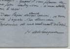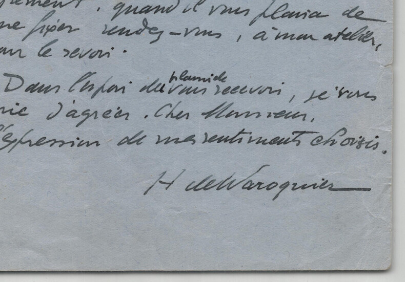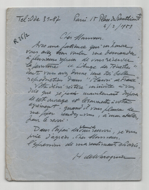 Henry de Waroquier. Lettre autographe signée à Olivier Quéant, 1953 Peintre français Lettre autographe signée d' Henry de Waroquier, adressée à Olivier Quéant , datée du 4 février 1953 à Paris, écrite à l'encre sur un feuillet de papier vélin bleu. "Cher Monsieur, Avec une patience qui m'honore, vous avez bien voulu me demander à plusieurs reprises de vous réserver la peinture "L'ange des Ténèbres" dont vous avez donné une très belle reproduction dans "Plaisir de France". Votre désir réitéré m'invite à vous dire que je peux maintenant disposer de cet ouvrage et les soumettre à votre agrément, quand il vous plaira de me fixer rendez-vous, à mon atelier, pour le revoir. [...]" Dimensions : 14,7 x 18,9 cm État : Note manuscrite au crayon au dos de la lettre. Voir photos et description pour plus de détails. Nombre de pages : 1 page Henry de Waroquier Henry de Waroquier né à Paris le 8 janvier 1881 et mort dans la même ville le 31 décembre 1970 est un peintre, sculpteur, dessinateur et graveur français, rattaché à l'École de Paris. Wikipédia